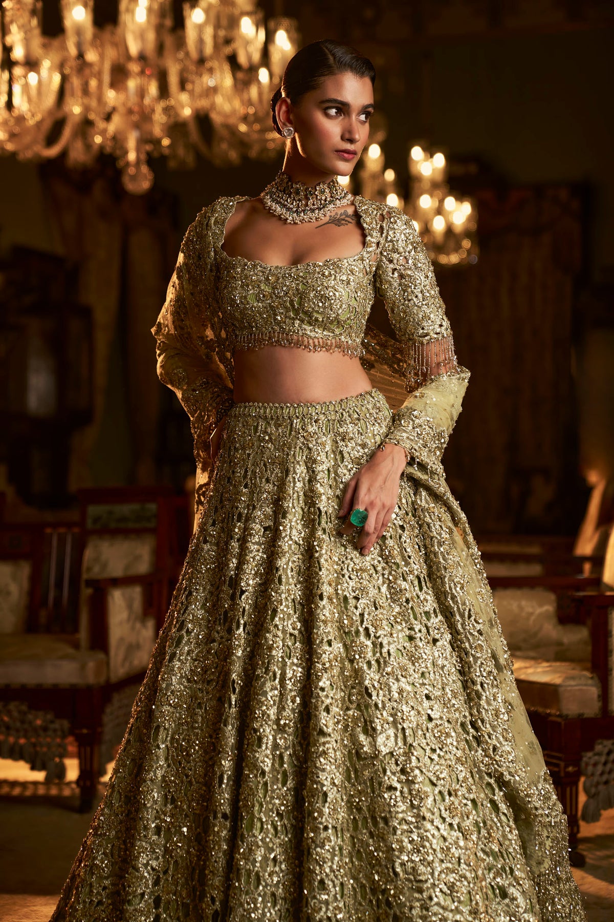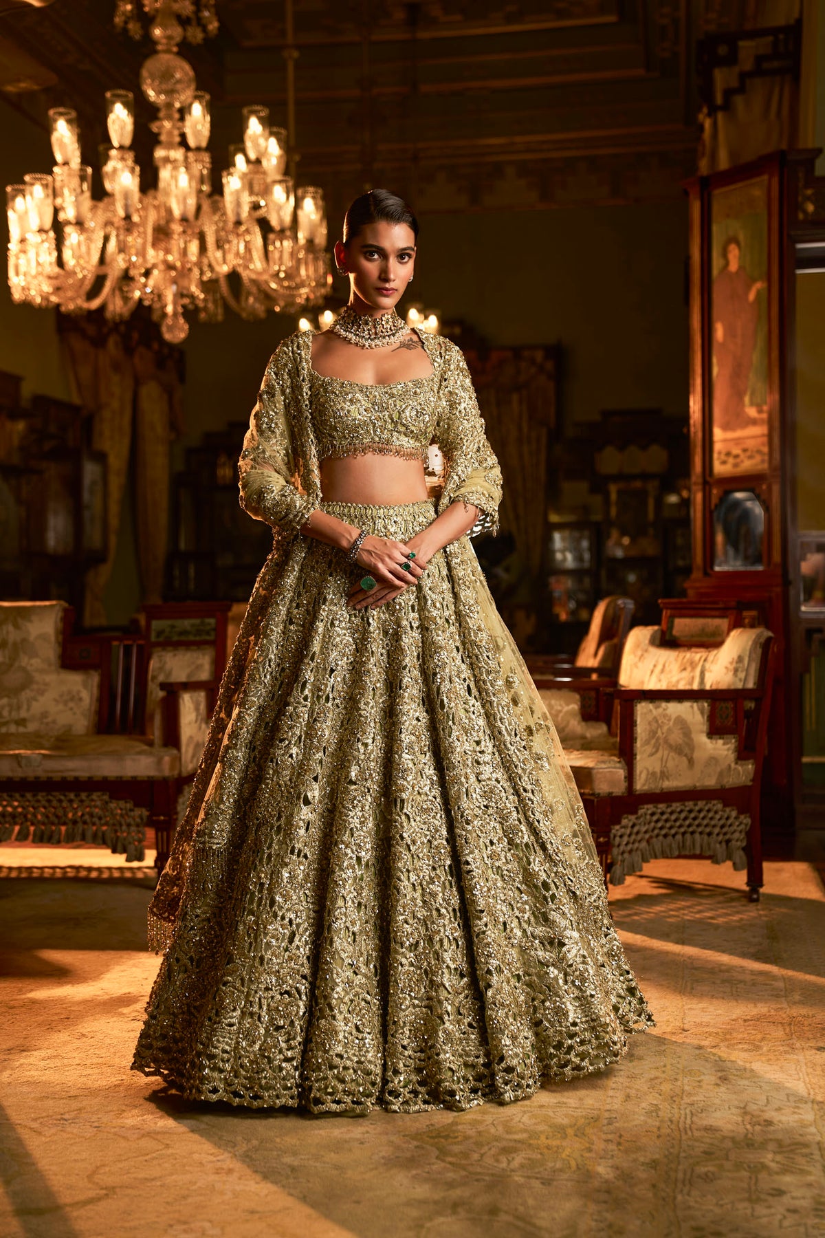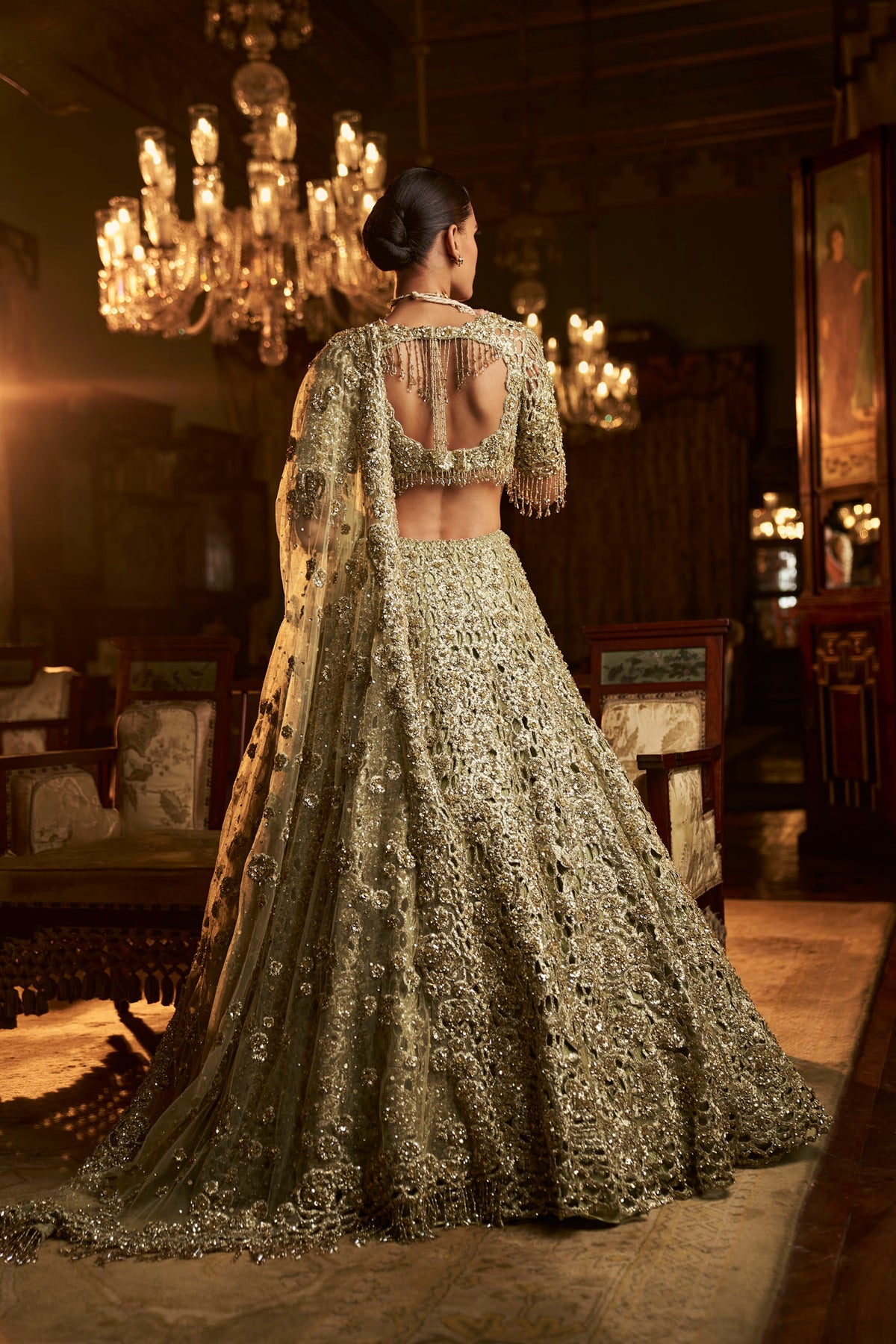 This lehenga set features heavy embroidery in sage green tones. The lehenga is further lined with sage green crush tissue. The blouse shows exaggerated tassels at the sleeve hem, elbow and at the back of the blouse. it is paired with a matching heavy embroidered with tassels on all four sides.