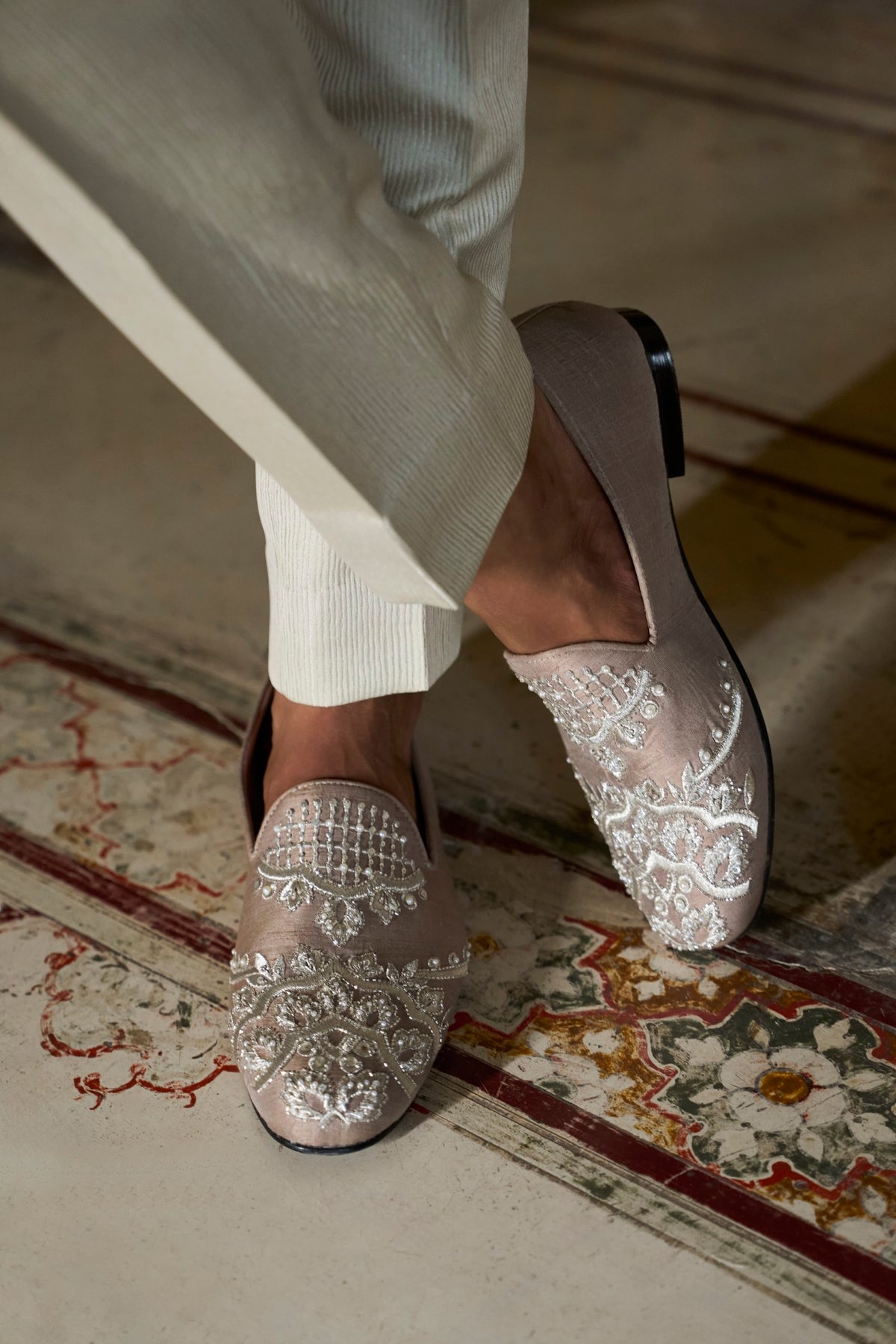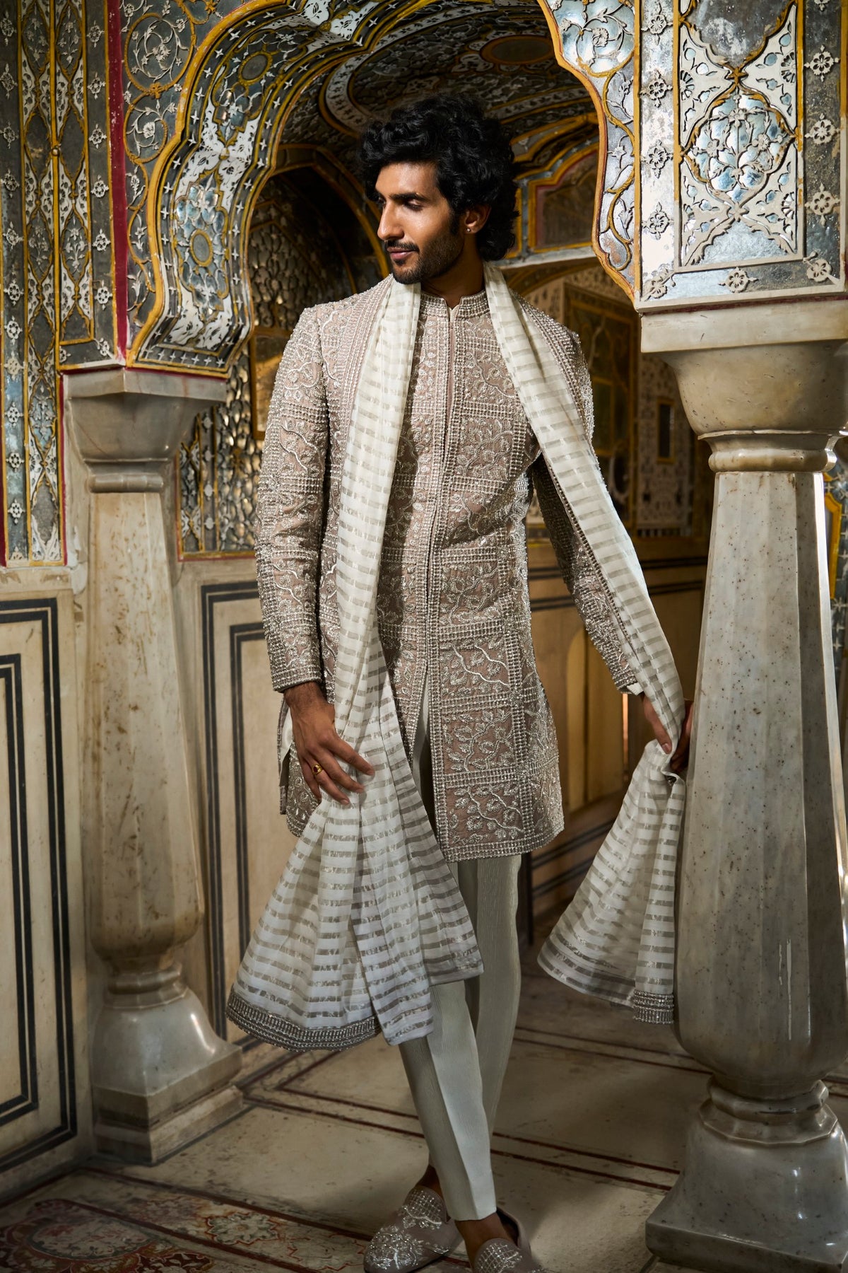 This sherwani set features muted silver thread embroidery on a nude raw silk base. This is further highlighted with delicate bugle beads. It is paired with light silver silk kurta and straight pants. Complementing stole and footwear is also available.