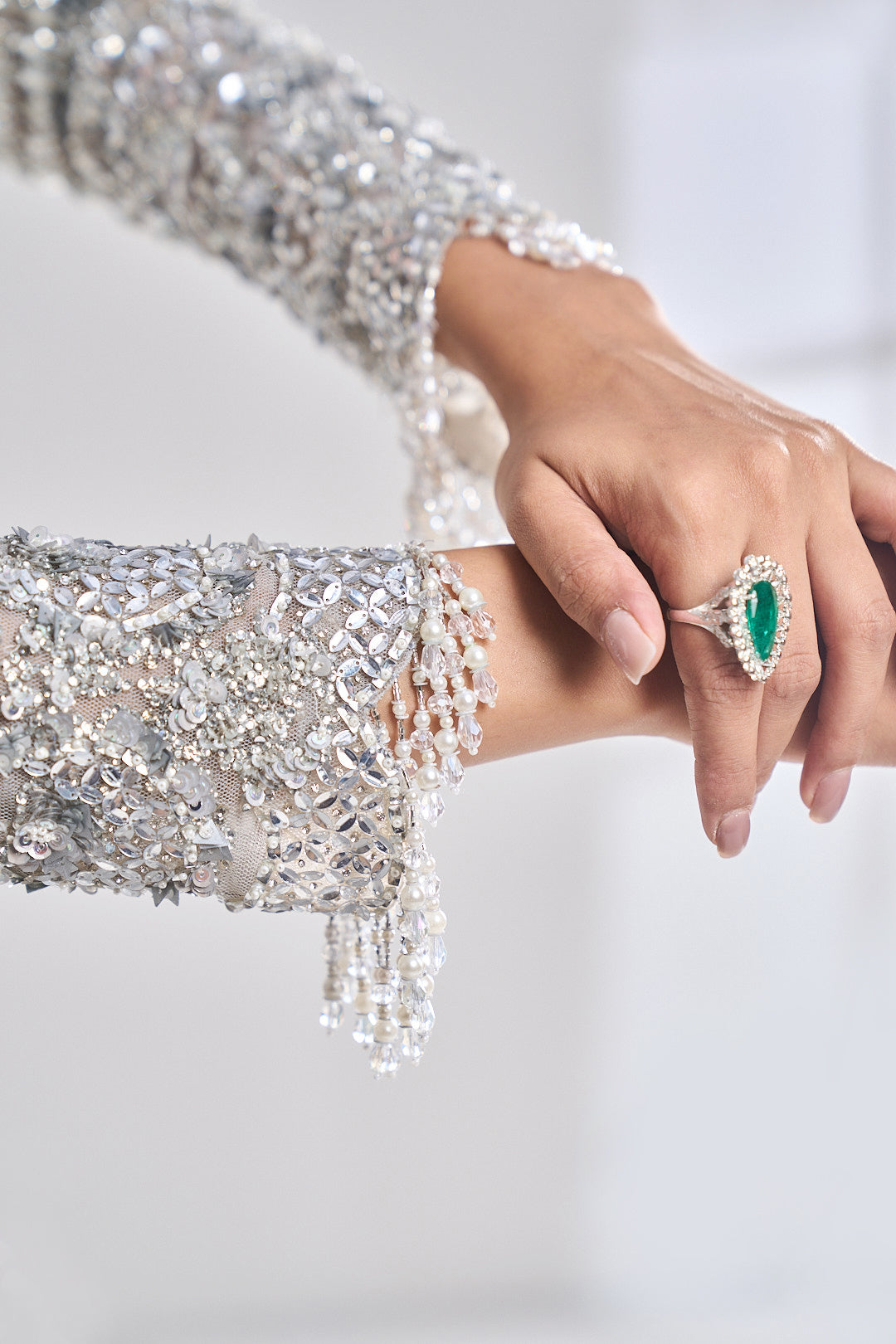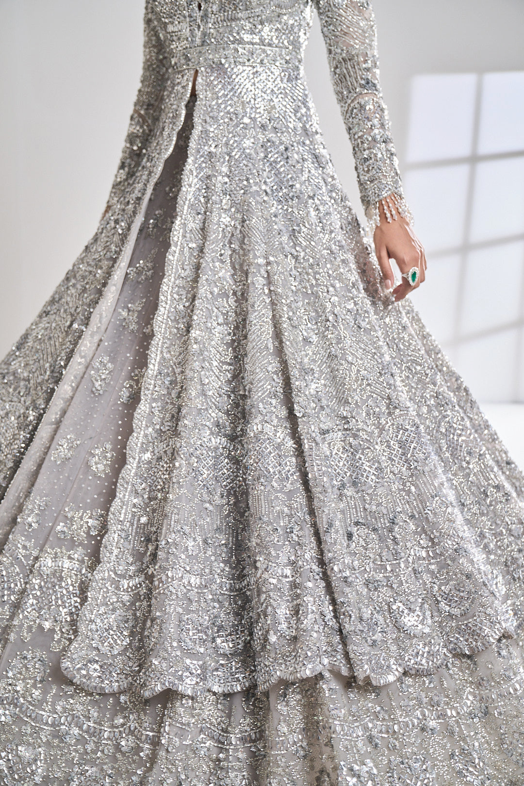 This lehenga set features all over silver sequin, bugle beads & crystal embroidery on the jacket and the cuff ends features tassel beads. The ensemble is paired with a matching dupatta with exaggerated tassels all around.