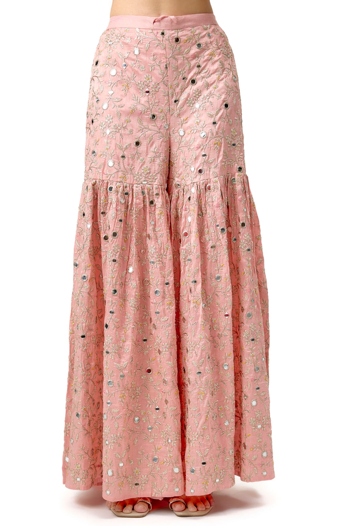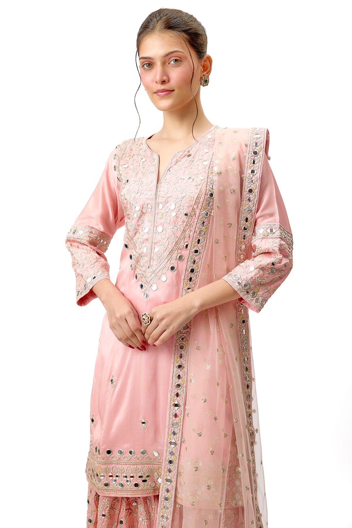 Featuring a kurta with intricate embroidery and mirror work on the neckline, yoke, and borders paired with sharara decorated in floral embroidery, enhancing the traditional appeal. Completing the look is a net dupatta embellished with scattered sequins and a detailed embroidered border.