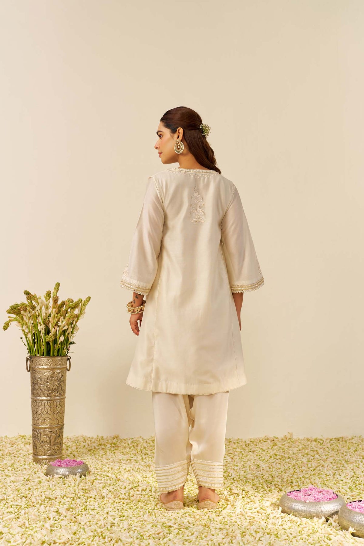 This refined ensemble is crafted from pure Silk Chanderi fabric, offering a luxurious feel and a timeless appeal. It is beautifully adorned with heritage Parsi Gara embroidery, showcasing intricate craftsmanship and cultural richness. The design features a contemporary zero-neck with a slit and elegant three-quarter bell sleeves, blending traditional elements with modern flair.