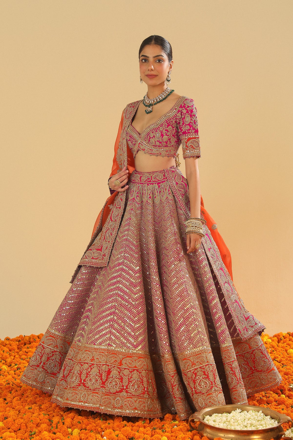 The lehenga is made in pure raw silk fabric and adorned with exquisite kirandori with sitaara and dabka zardozi embroidery. The blouse will have broad, deep V neckline at front and back with elbow sleeves. The dupatta will be in silk organza with border and bootis. The lehenga is finished with a contarst banarsi and kinari.