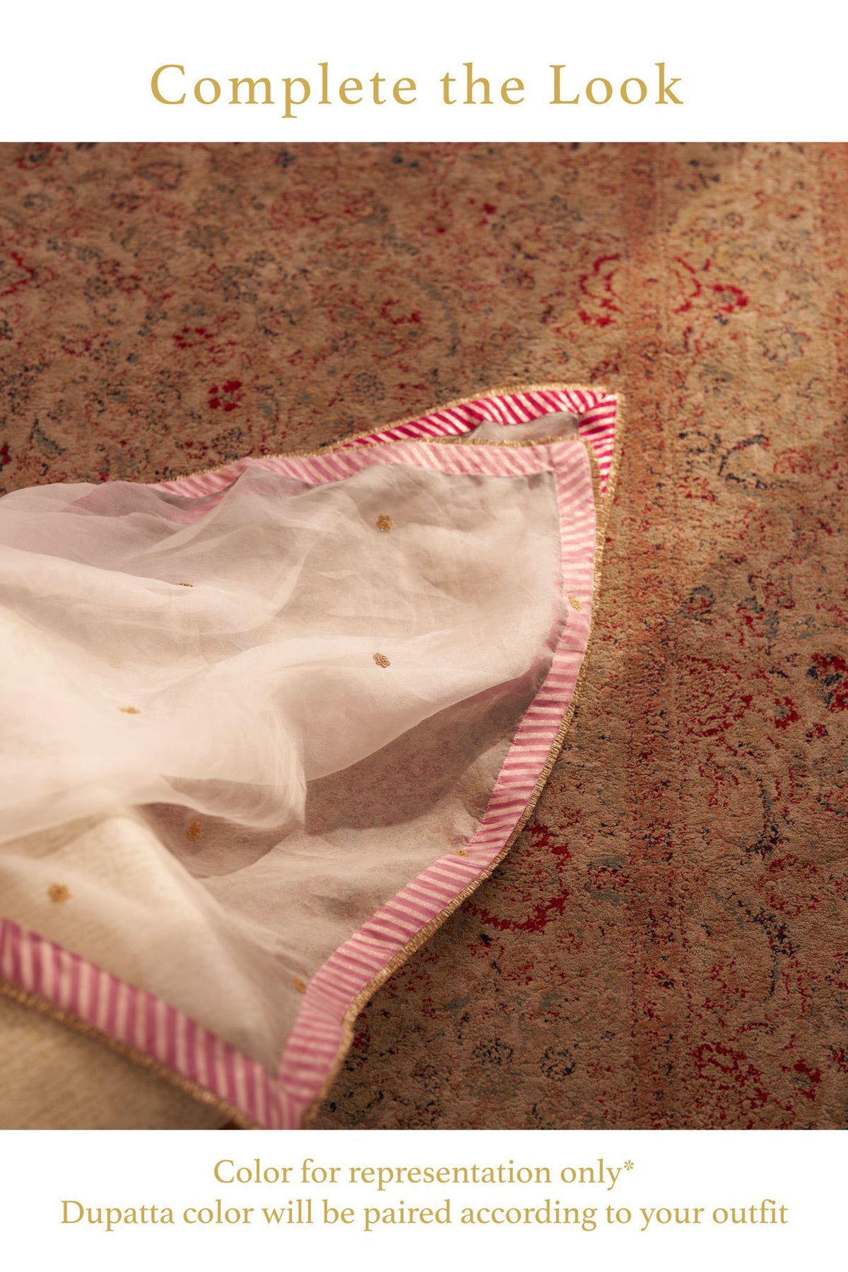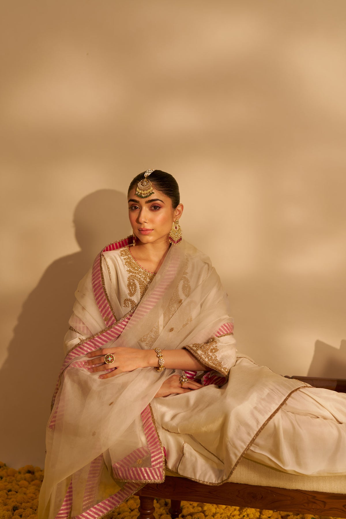This elegant Ayra ensemble is crafted from pure Upada silk fabric, offering a luxurious drape and rich texture. The outfit is beautifully adorned with intricate kirandori embroidery and delicate Basra moti embellishments, lending a timeless charm to the piece.