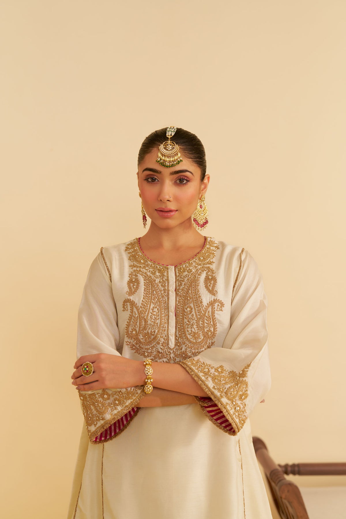 Designed with a zero neckline featuring a subtle slit, the kurta showcases three-quarter bell sleeves for a graceful silhouette. The kali panels are finished with traditional kiran detailing, enhancing the overall aesthetic.