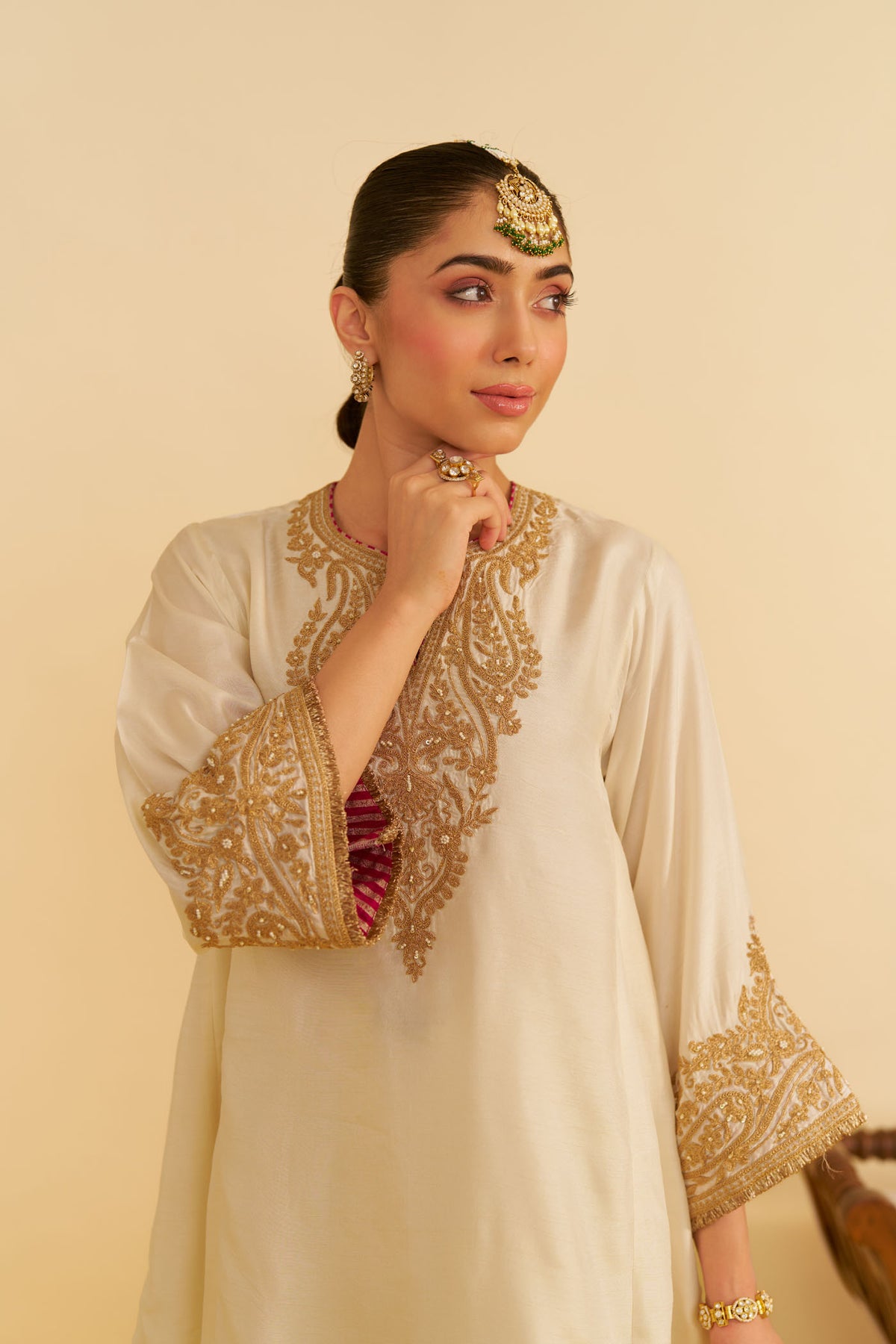 It features a zero neckline with a slit and three-quarter bell sleeves, finished with traditional Kiran detailing for added elegance. The ensemble is paired with a classic Dogri salwar, bringing together a perfect blend of tradition and style. The entire outfit is completed with a contrasting Banarasi fabric, enhancing its rich and timeless aesthetic.