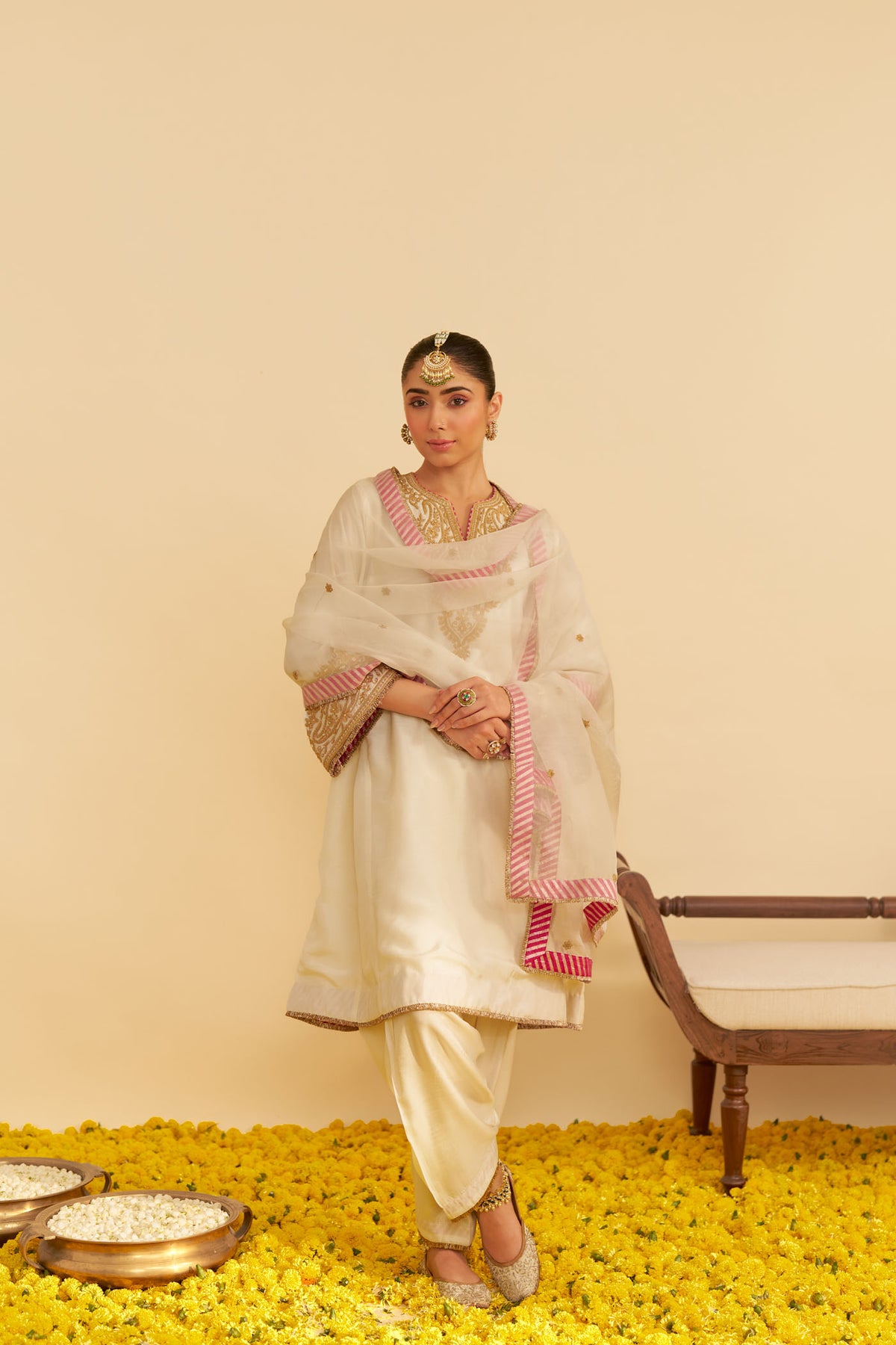 The Marwa ensemble is crafted from pure Upada silk, offering a luxurious and elegant appeal. The outfit is adorned with intricate Kiran Dori embroidery and delicately highlighted with pearls, adding a touch of refined sophistication.