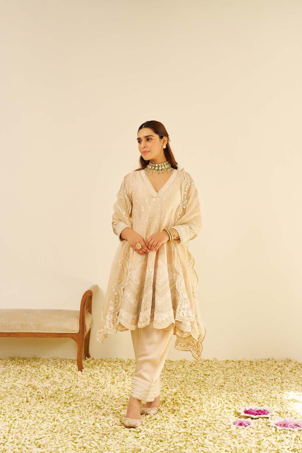Adorned with intricate Parsi Gara embroidery, the ensemble is further highlighted with shimmering Tilla, Gota, and Basra Moti embellishments, adding depth and opulence to the design. The sleeves of the kurta are finished with detailed pearls, providing a refined and elegant touch. To complete the look, the outfit is beautifully finished with scallop detailing, enhancing its overall sophistication and making it a truly exquisite creation.