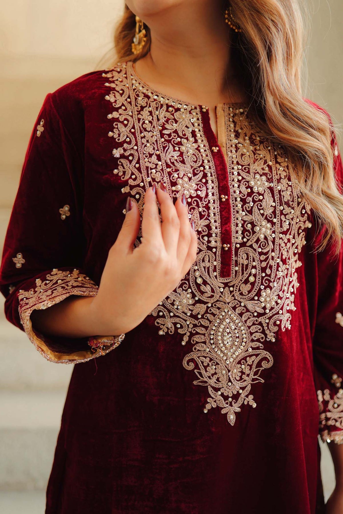 This short straight ensemble is crafted from luxurious pure silk velvet, paired seamlessly with a traditional Dogri salwar. The outfit features a stylish zero-neck with a placket and three-quarter bell sleeves, offering a contemporary yet timeless silhouette. Adorned with intricate kirandori embroidery and shimmering sitaara, it radiates elegance and charm. The ensemble is beautifully finished with pure tissue fabric and delicate kinari, adding the perfect final touch to this stunning, refined look.