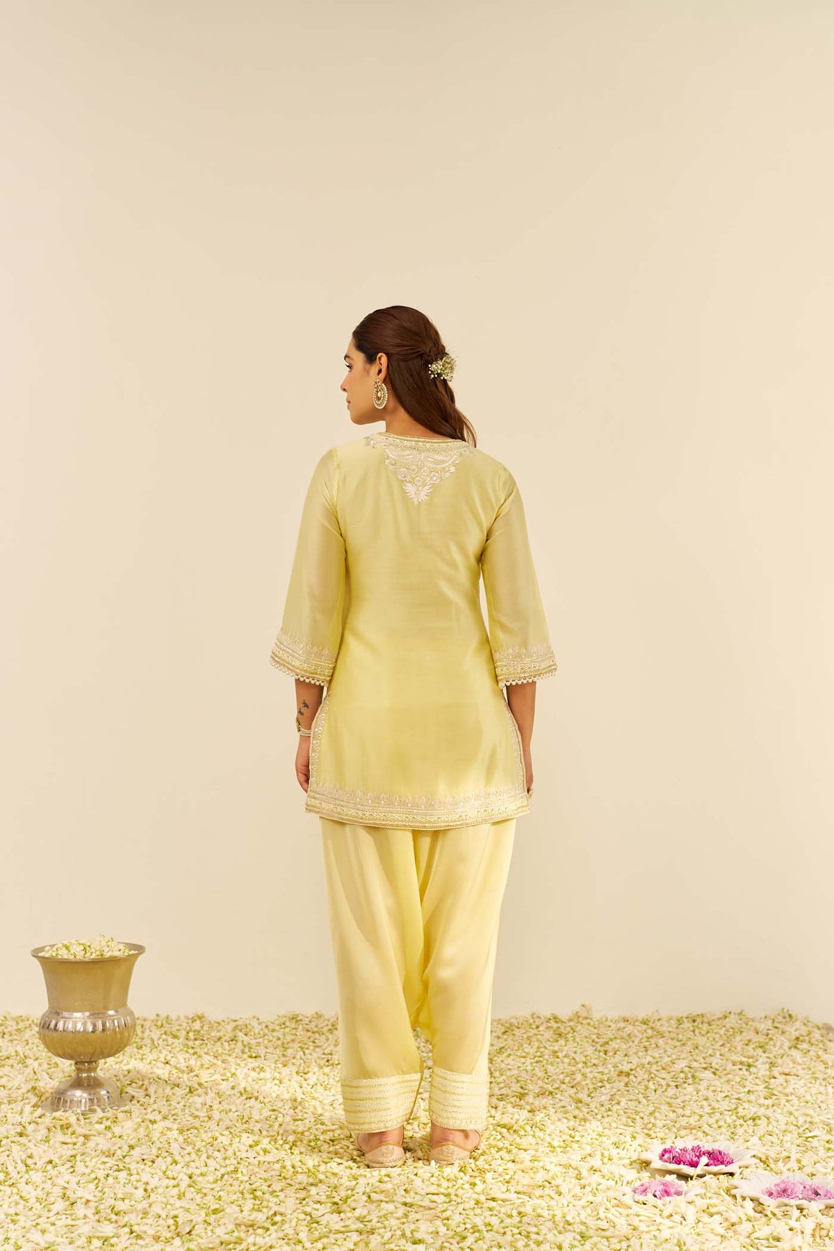 This elegant short A-line Sara ensemble is crafted from pure Silk Chanderi fabric, offering a luxurious and graceful silhouette. It is beautifully teamed with a traditional Dogri salwar and a delicate Silk Organza dupatta, adding a soft and ethereal touch to the look. The outfit features a sophisticated zero-neck design with a slit and three-quarter sleeves, combining modern elements with timeless elegance.
