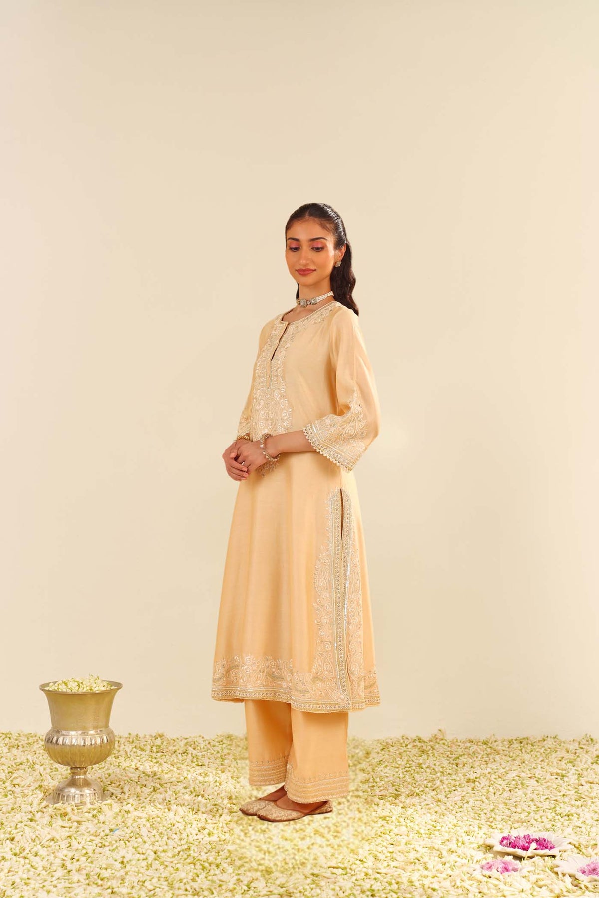 This exquisite long A-line ensemble is crafted from pure Silk Chanderi fabric, offering a luxurious and elegant silhouette. The outfit is paired with a palazzo and a delicate Silk Organza dupatta, adding a soft, ethereal touch to the overall look. It features a sophisticated zero-neck design with a placket and three-quarter sleeves, beautifully merging modern styling with traditional elements.