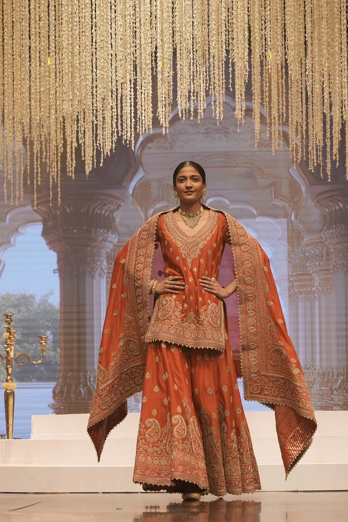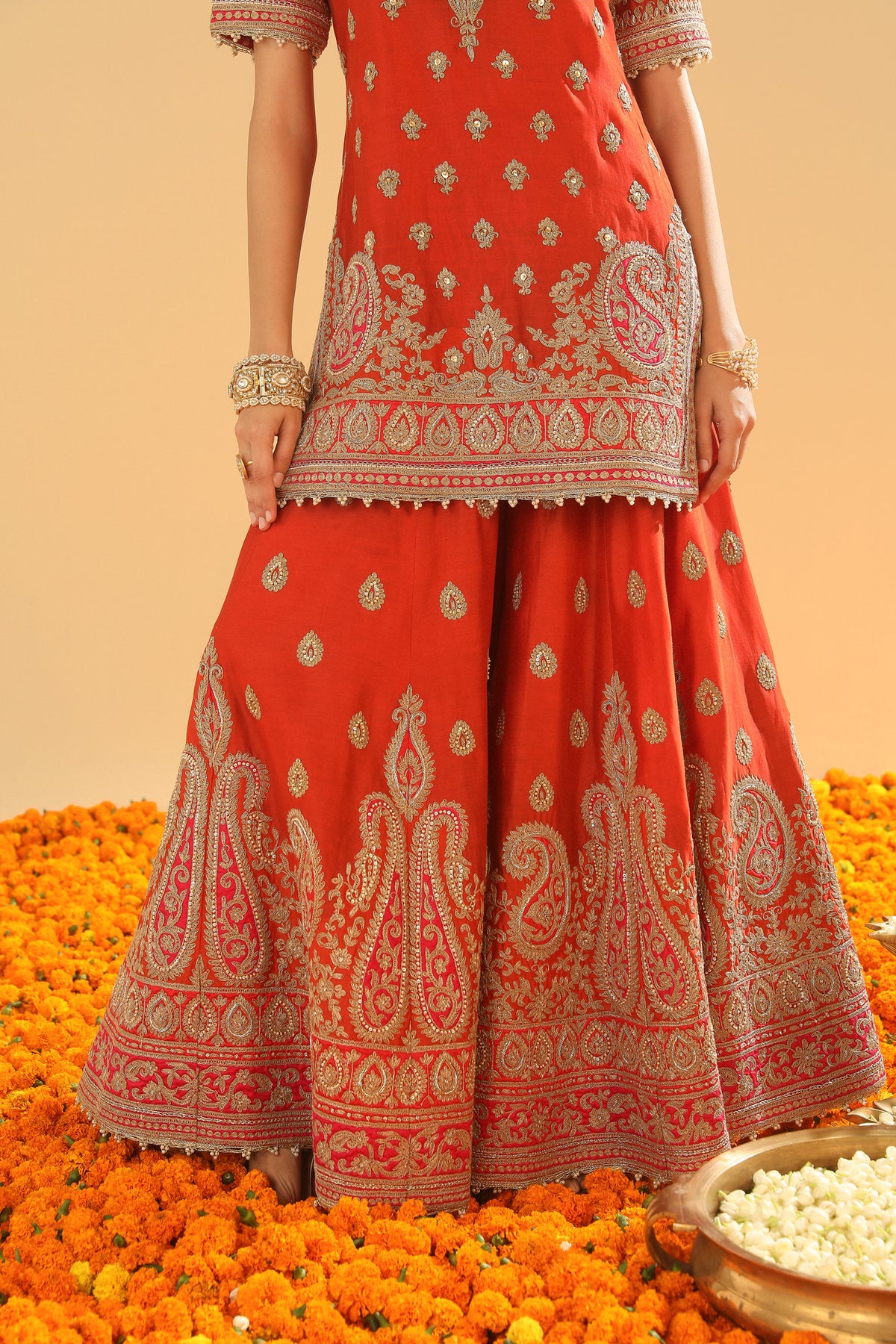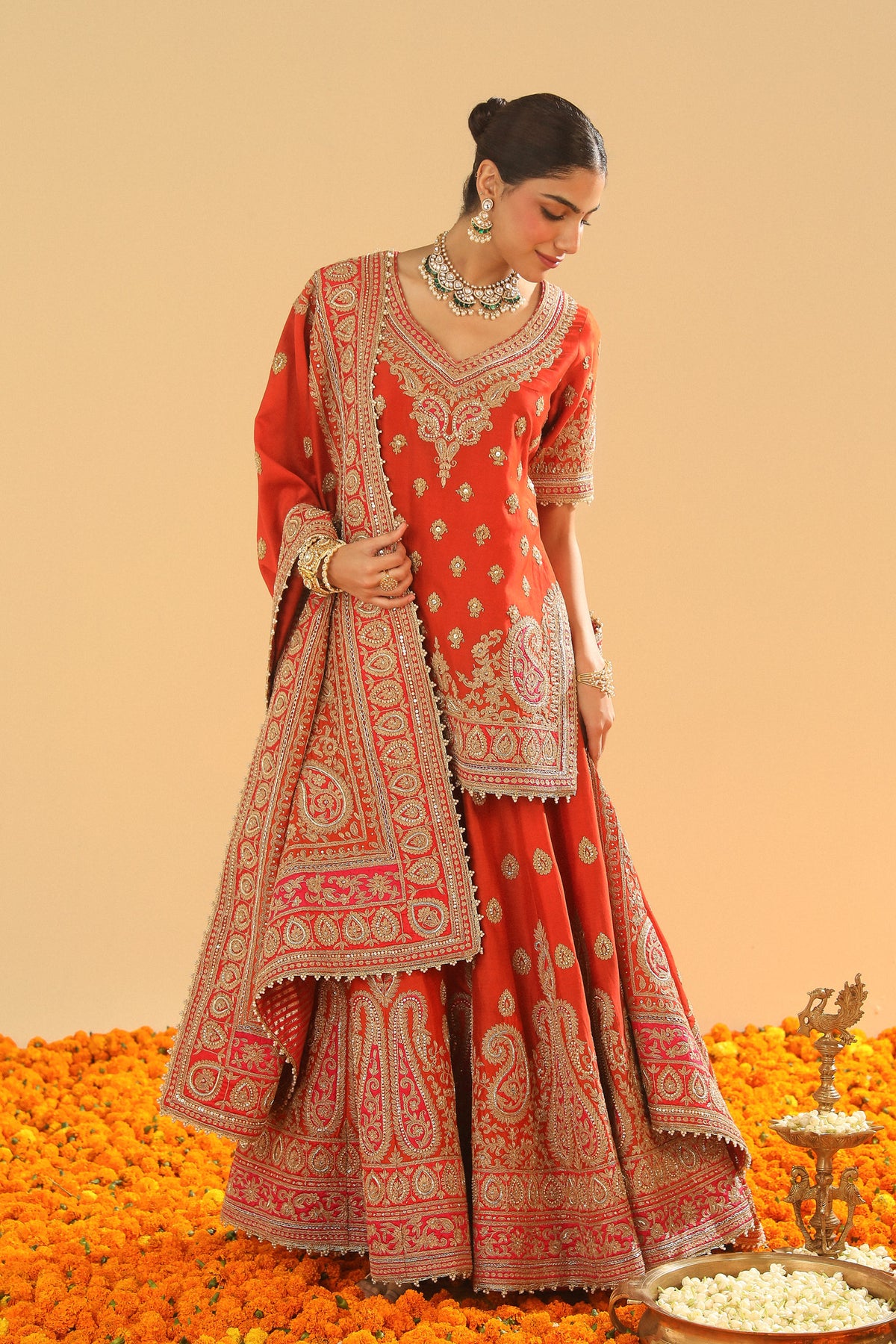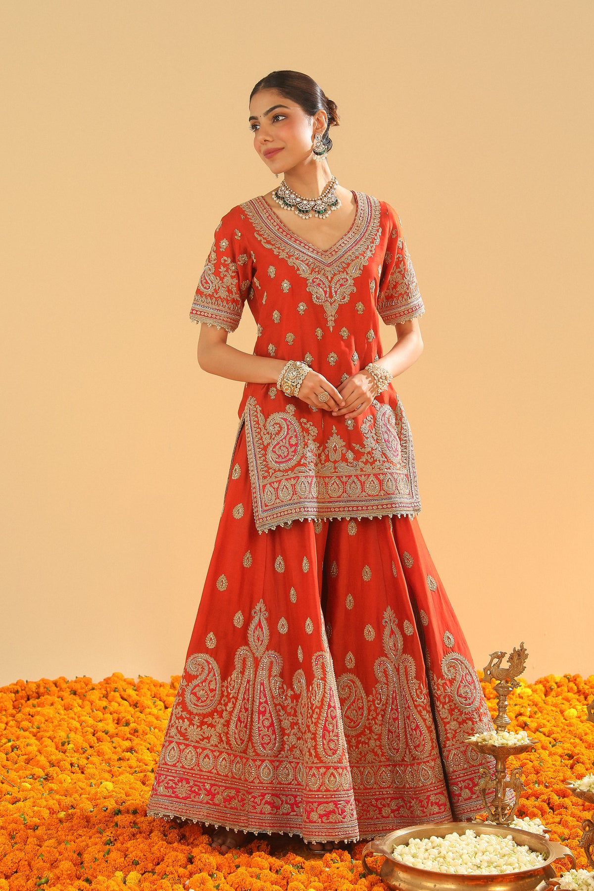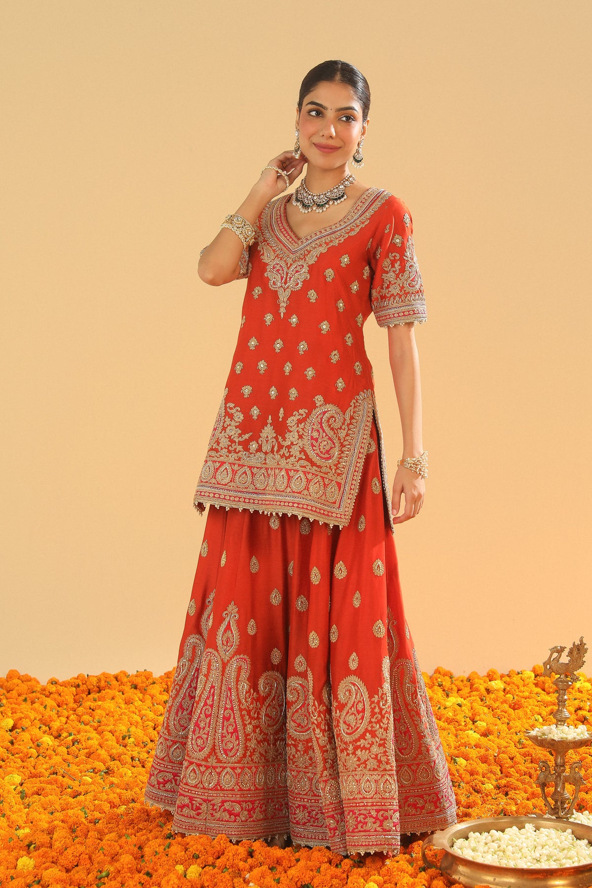 The short straight kurta set is made in pure silk chanderi and teamed up with an odhni. The kurta is having a broad and deep V neck at front, a zero back and elbow sleeves.The outfit is adorned with exquisite kirandori with sitaara and dabka zardozi. The outfit is finished with a contrast banarsi and kinari.