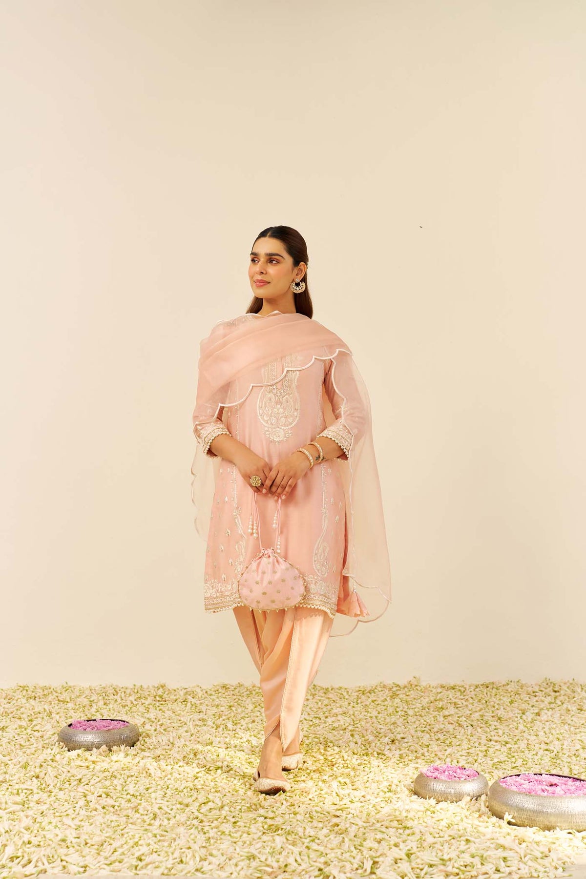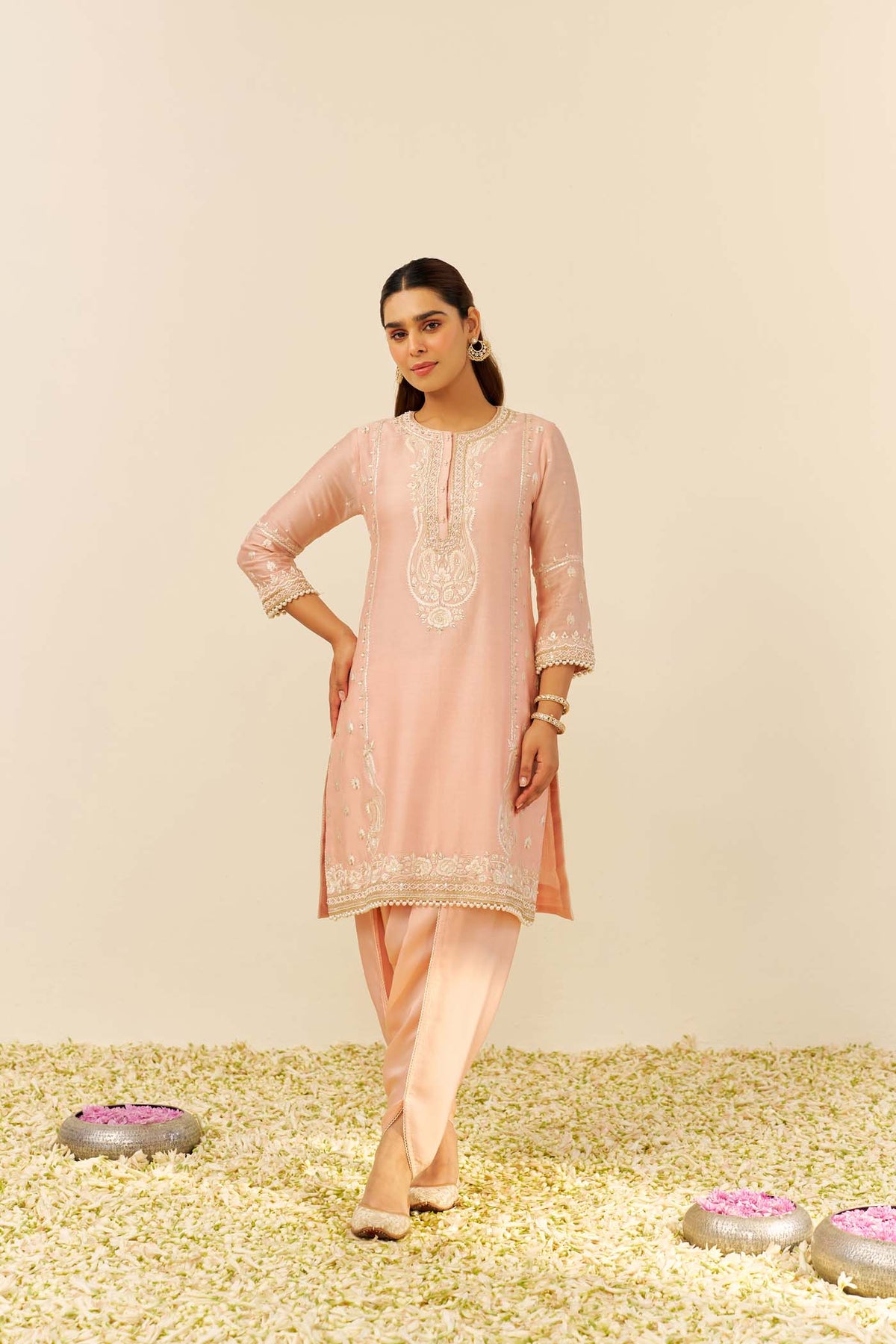 Paired with a stylish tulip dhoti, the ensemble radiates a unique sense of grace and sophistication. The entire creation is beautifully highlighted with delicate Tilla, Gota, and pearls, which enhance the intricate embroidery and elevate the overall look. Finished with the finest Chanderi silk fabric, this ensemble is a perfect fusion of heritage, craftsmanship, and modern style.