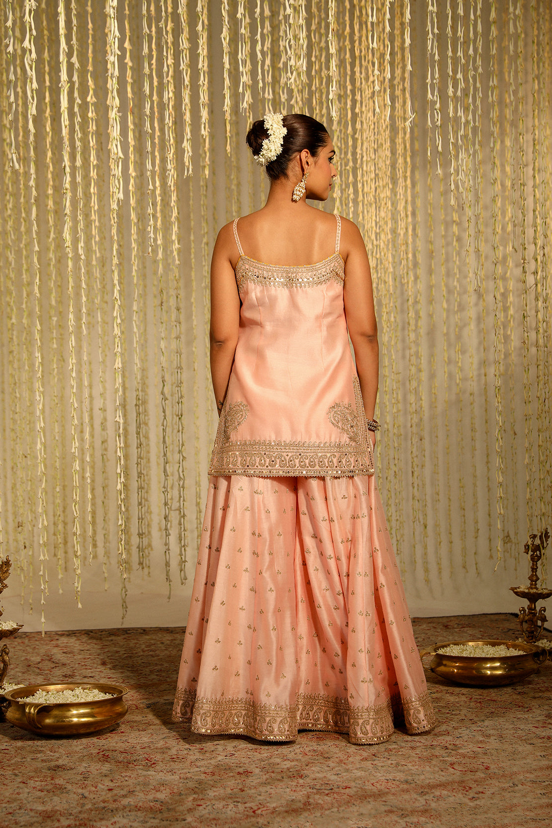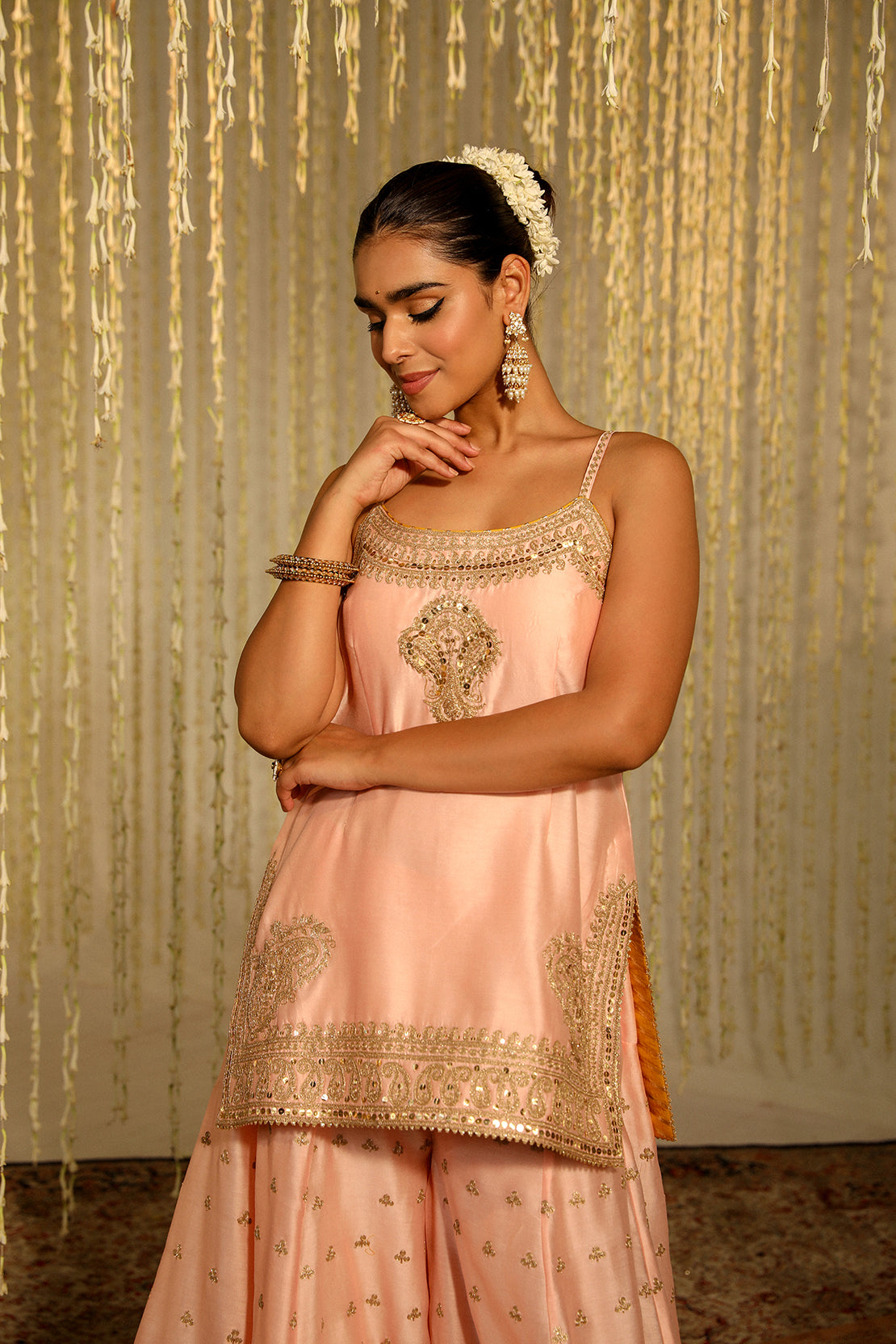 The short straight Aabroo kurta set is made in pure silk chanderi and teamed up with a silk organza dupatta. The kurta is having a round broad deep scoop neck at front, a deep back and no sleeves. The sharara is having a border with all over bootis. The outfit is adorned with exquisite kirandori with sitaara. The outfit is finished with a contrast banarsi and kinari