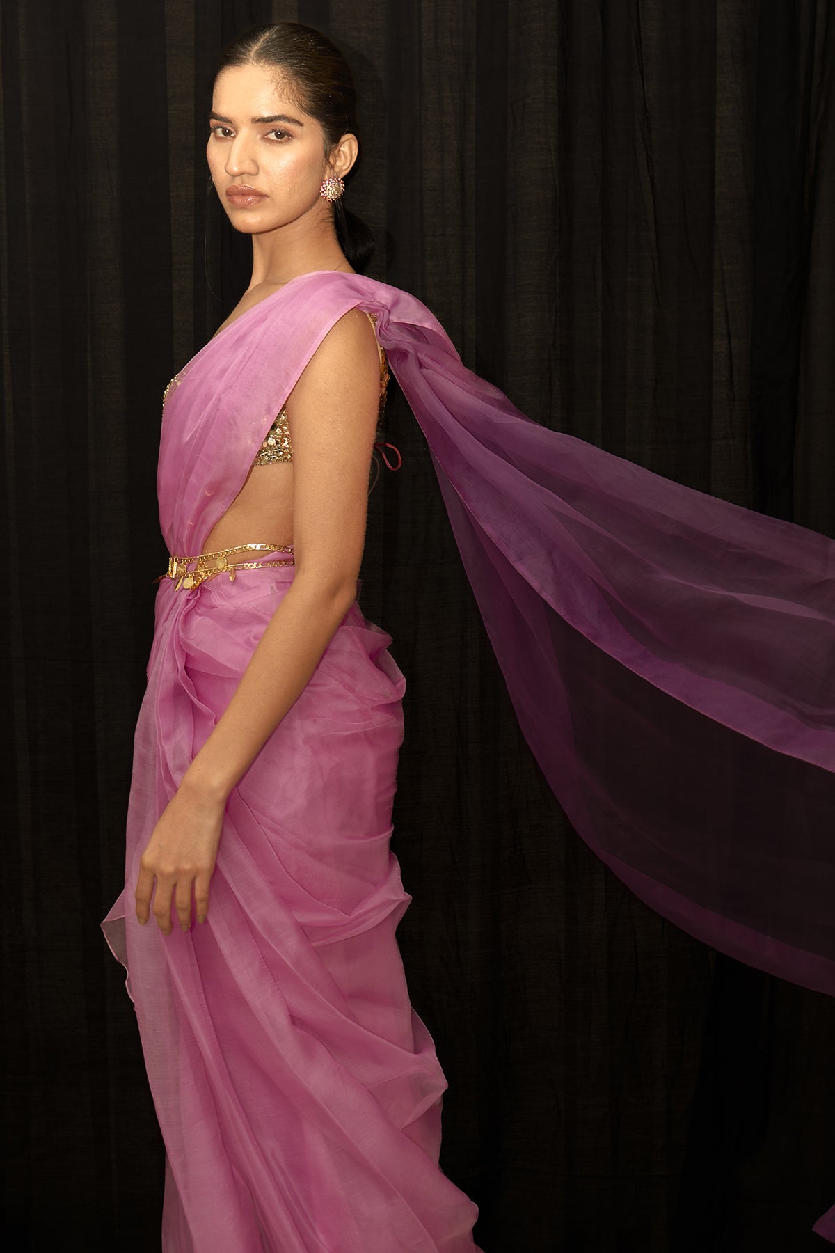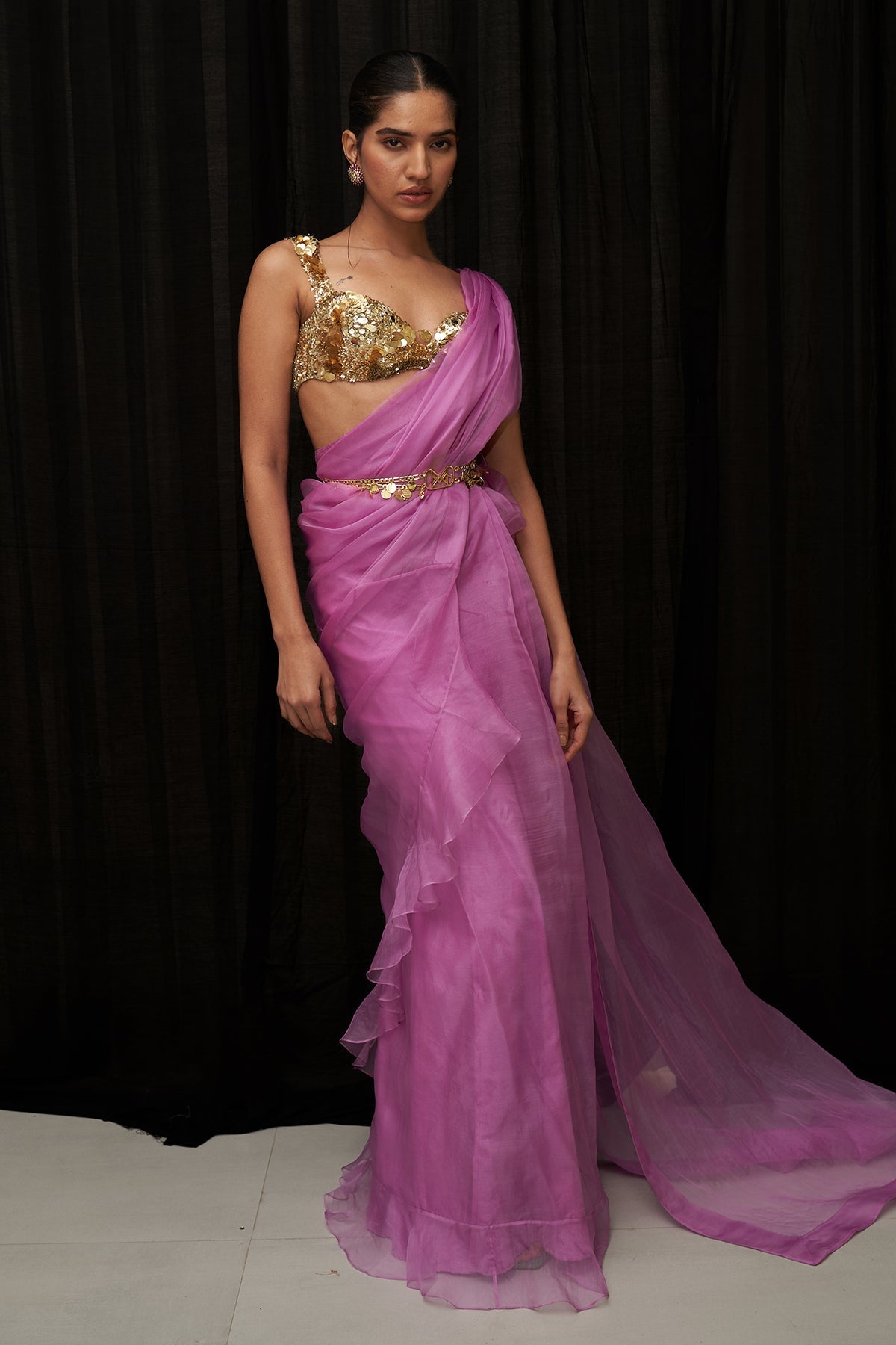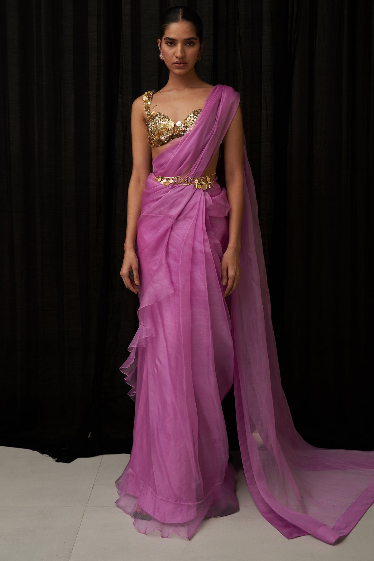 LILAC PRE DRAPED SAREE WITH EMBROIDERED BLOUSE AND BELT