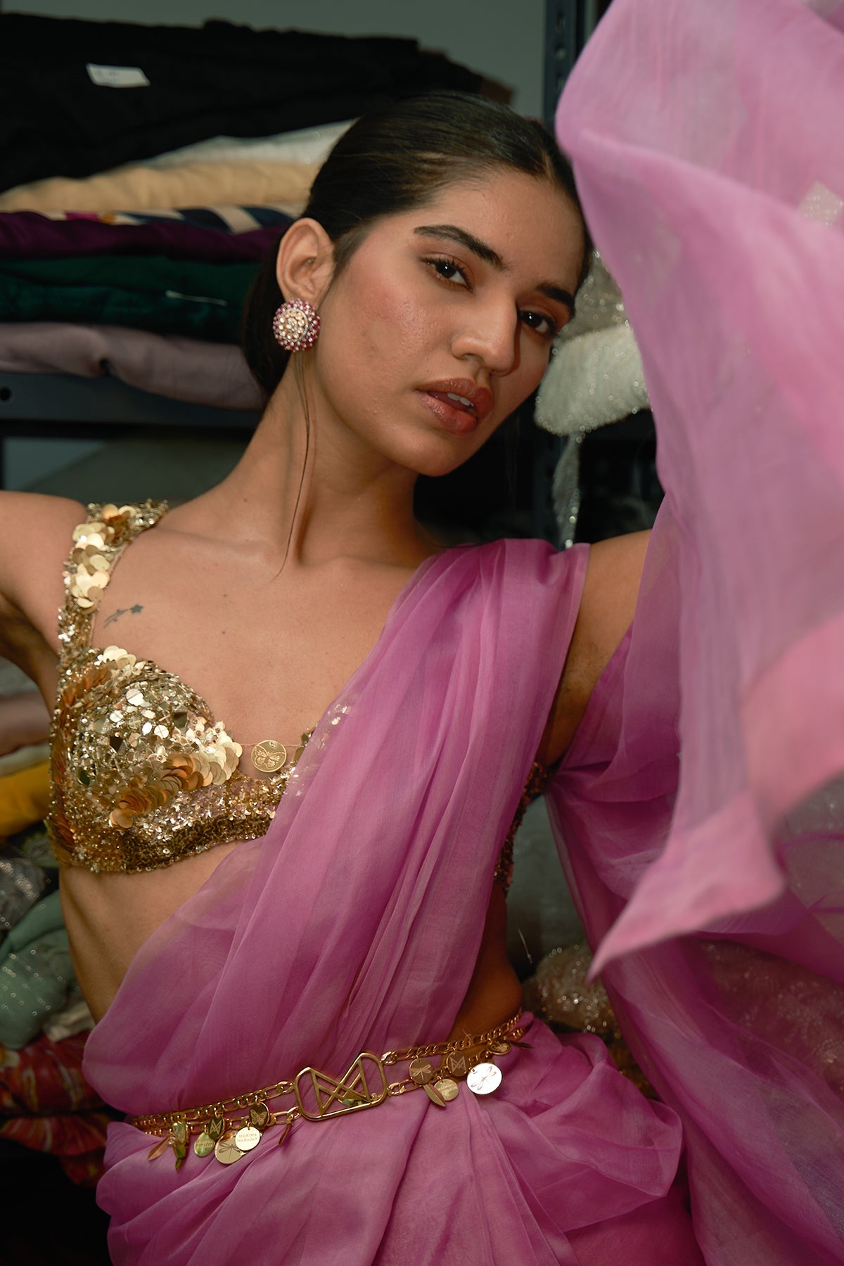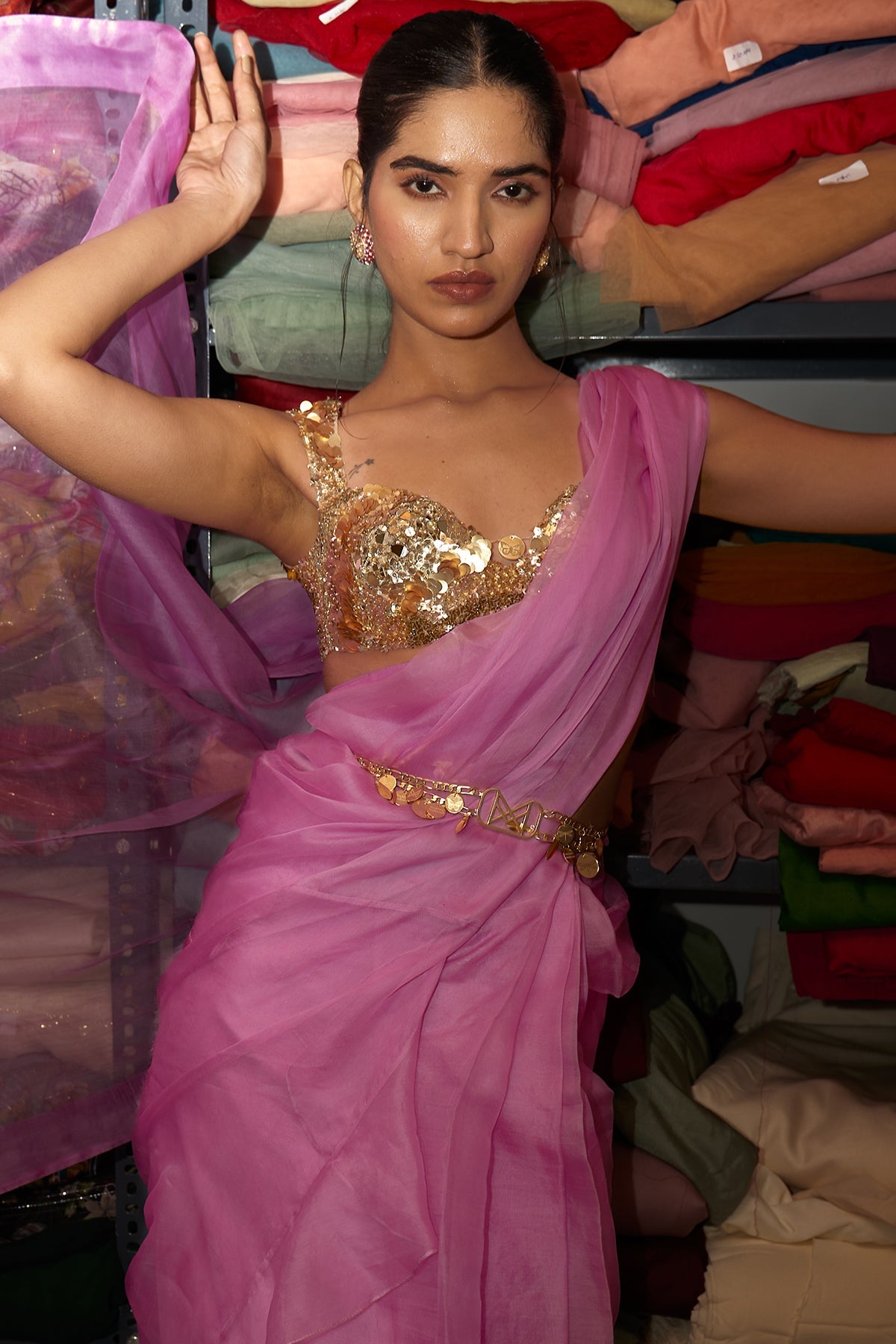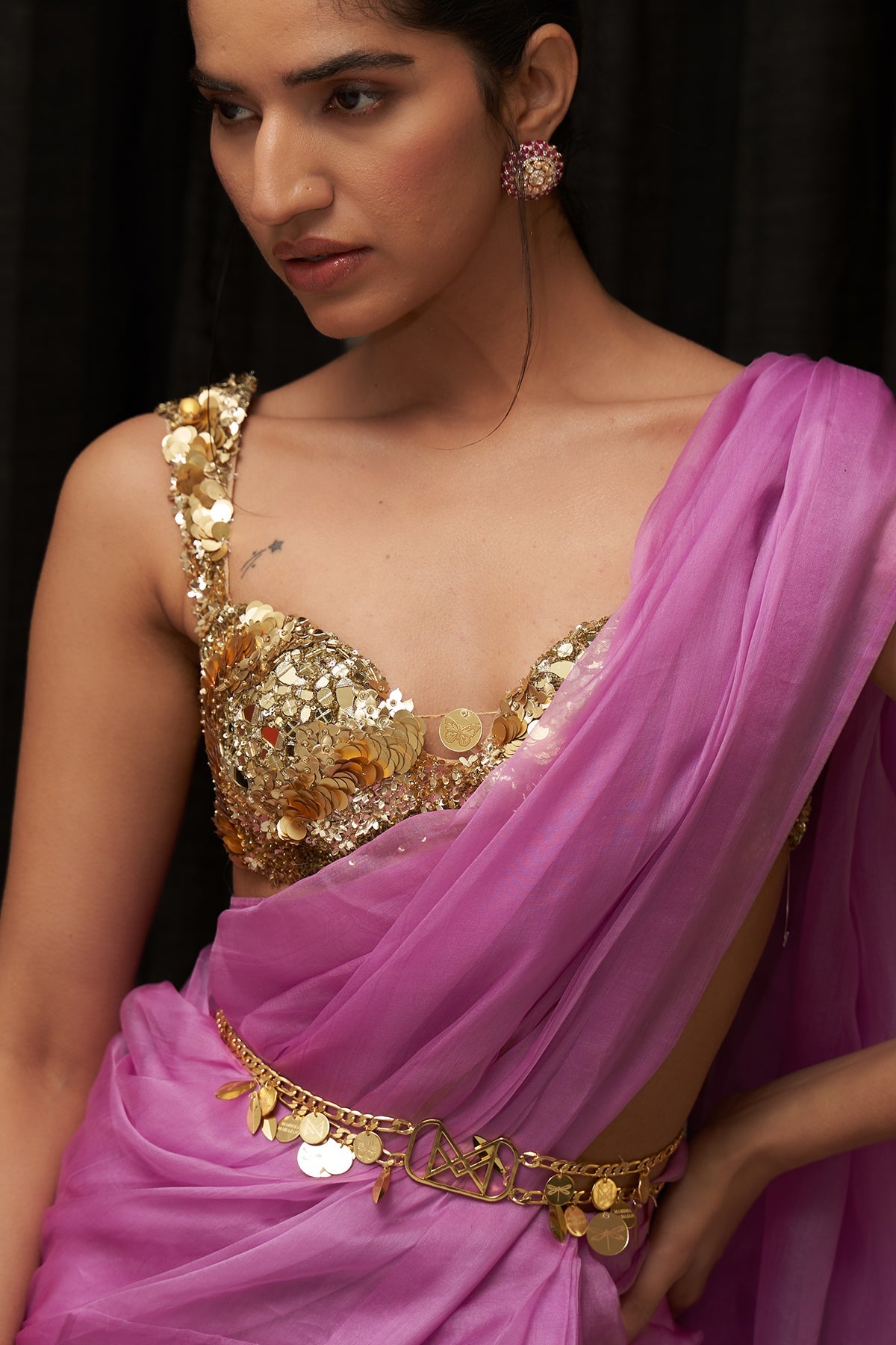 LILAC PRE DRAPED SAREE WITH EMBROIDERED BLOUSE AND BELT
