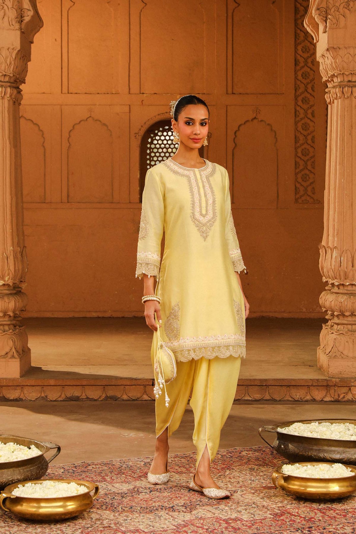 The Anika short kurta with salwar from our Mehnoor Collection is made in silk chanderi with a dhoti. The kurta is having a zero neck with slit and three-quarter bell sleeves. The kurta is adorned with Kashmiri tilla and parsi gara embroidery highlighted with basra moti. The sleeves of the kurta is a having an organza detailing. The outfit is finished with scallop detailing.