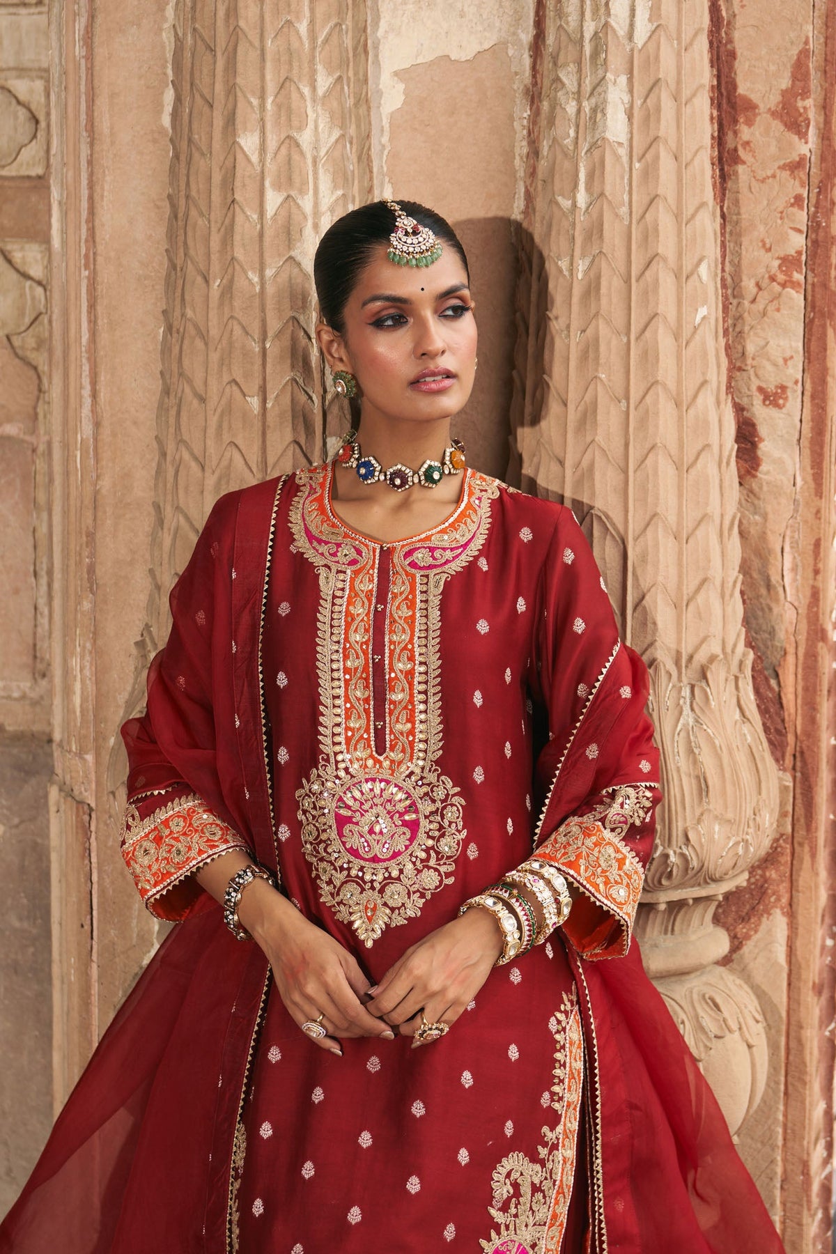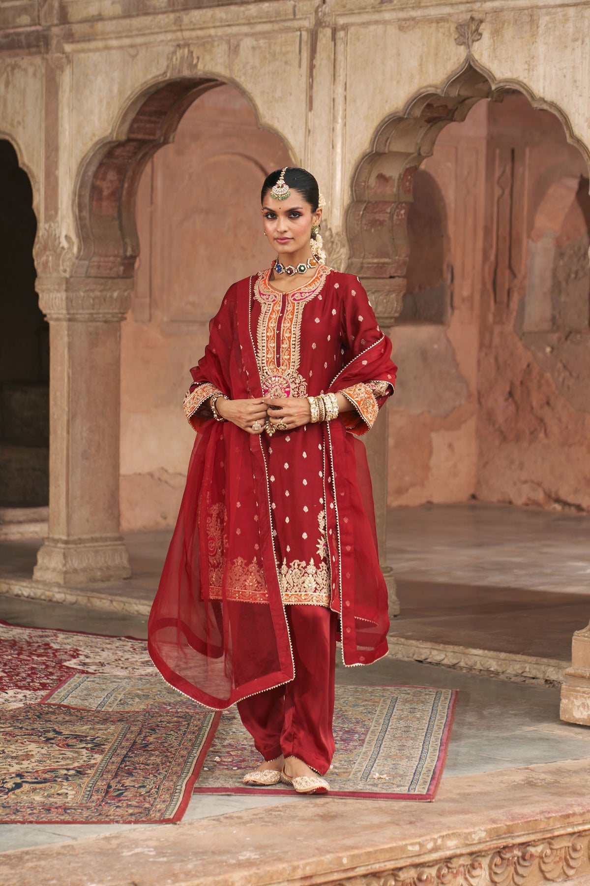 A timeless kurta crafted in pure Silk Chanderi Banarasi, paired with a classic Dogri salwar. Featuring a zero neckline with placket and three-quarter sleeves, the ensemble is adorned with Kashmiri Tilla and Gota Patti embroidery, highlighted with pearls and sequins. Finished with elegant gota detailing for a regal touch.