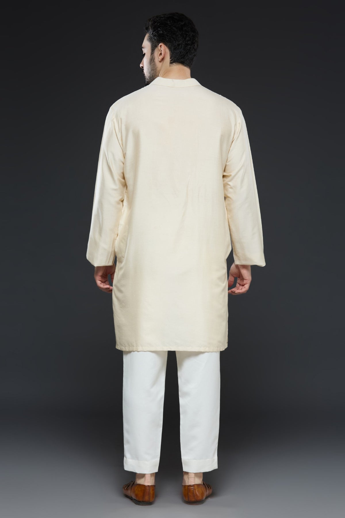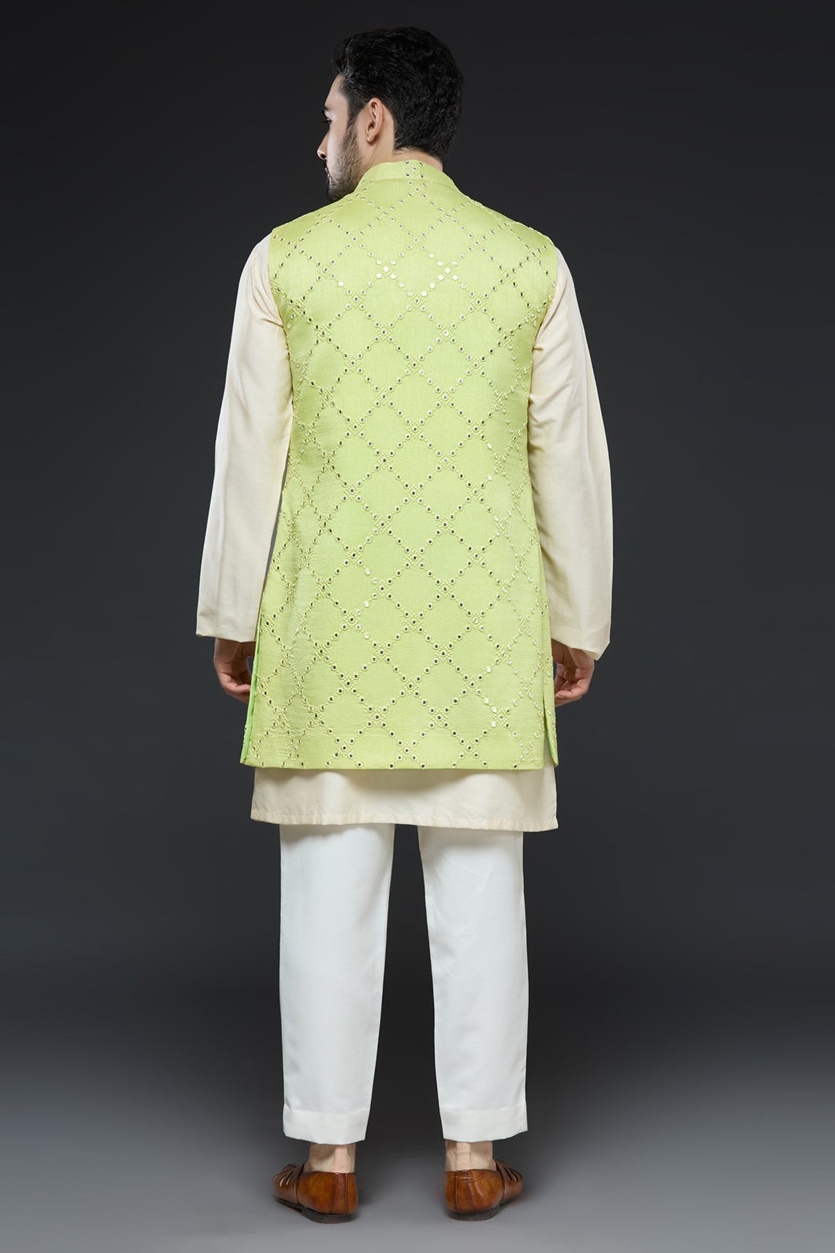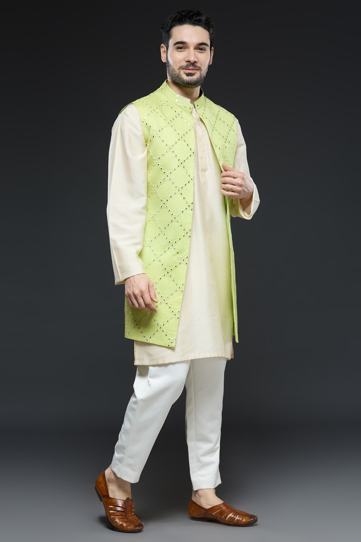 Ivory kurta and slim pant set paired with Bright Green long open jacket with art mirror and thread work