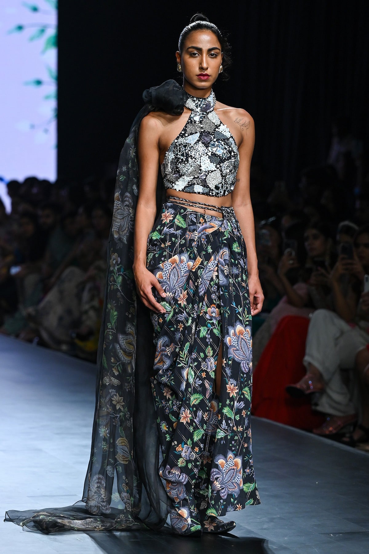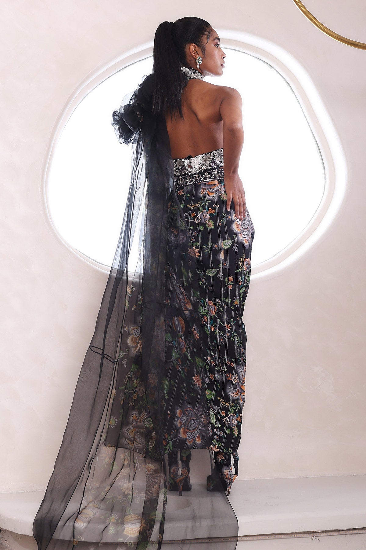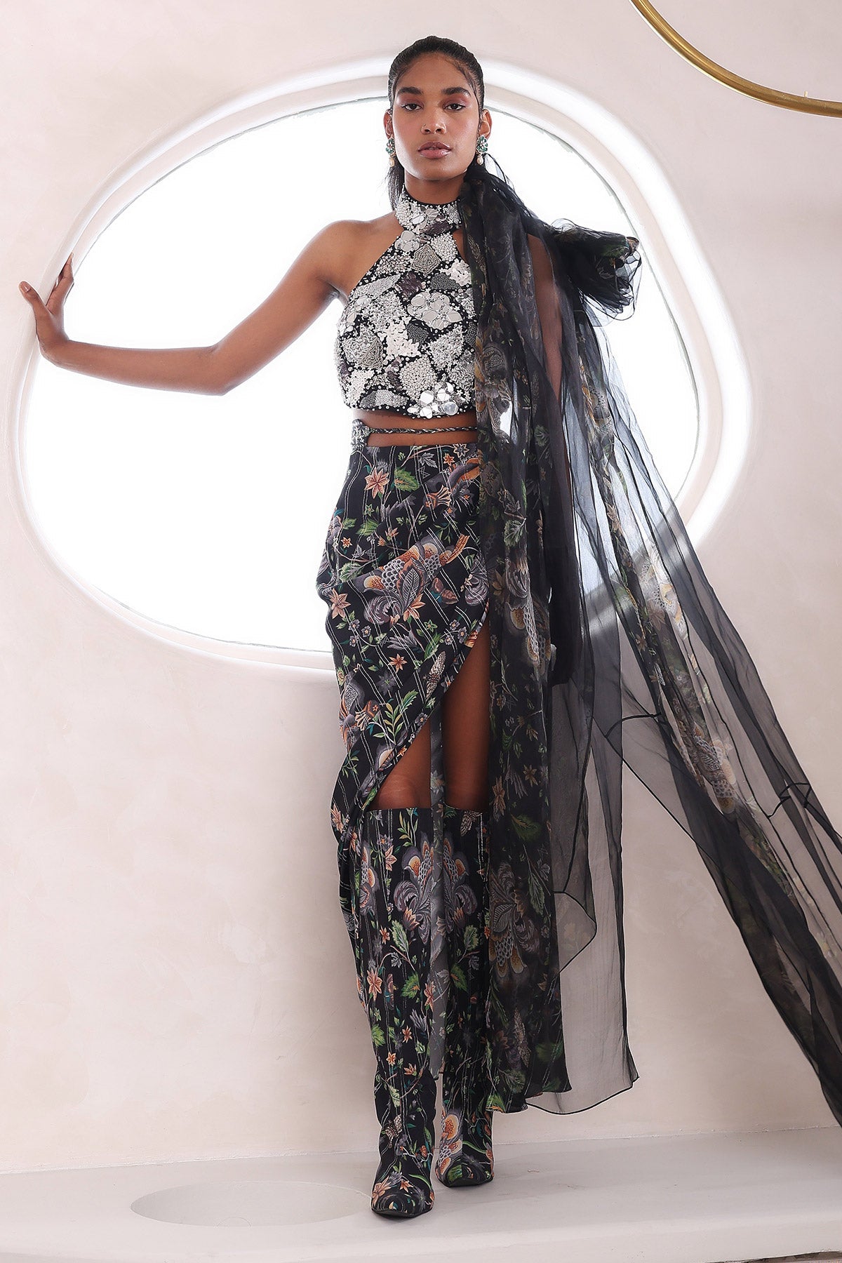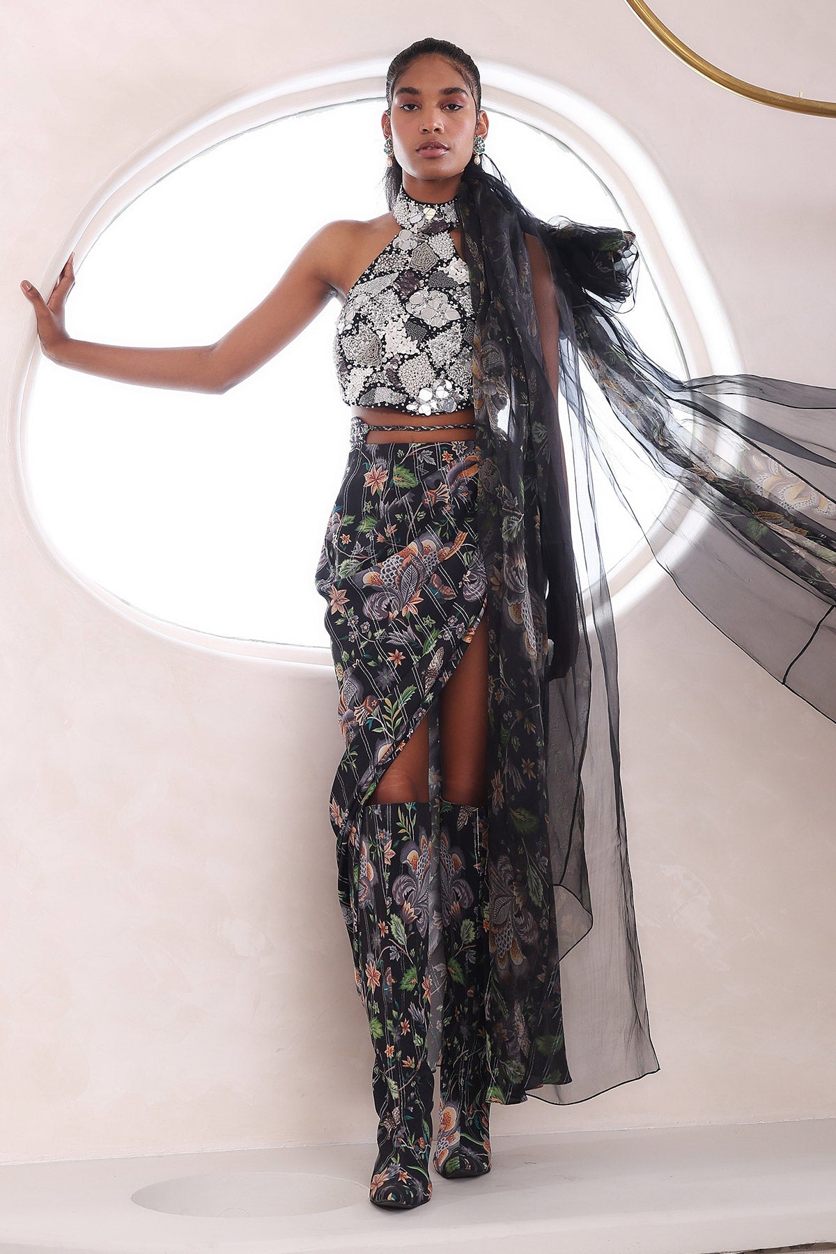 EMBROIDERED TOP WITH DRAPED SKIRT AND DRAPE