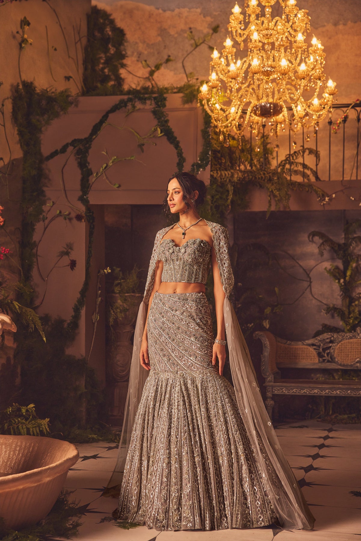 Showcasing Elliora lehenga set with a intricate hand embroidery with dancing sequins and faceted beads. This striking ensemble blends vintage charm with modern finesse. Featuring a fishtail-style lehenga skirt with intricate panelled embroidery, with a graceful flair at the hem. The corset blouse is heavily embellished with tonal threadwork, sequins & 3d flowers and styled with soft scalloped detailing that mirrors the romantic mood of the look. Paired with a delicate net cape, lightly adorned with embroidered motifs, drapes effortlessly over the shoulders, adding a touch of ethereal grace. The collection celebrates couture artistry with shimmering embellishments, structured forms, and flowing drapes—each piece designed to embody celebration, romance, and timeless drama.