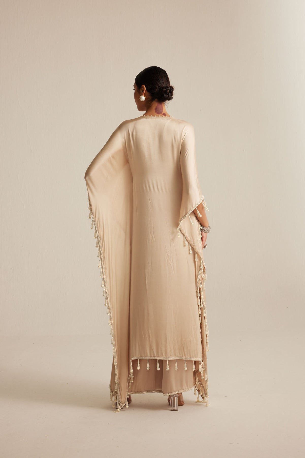 Light beige Kaftaan set with pearl embroidery, paired with a Satin Pants.