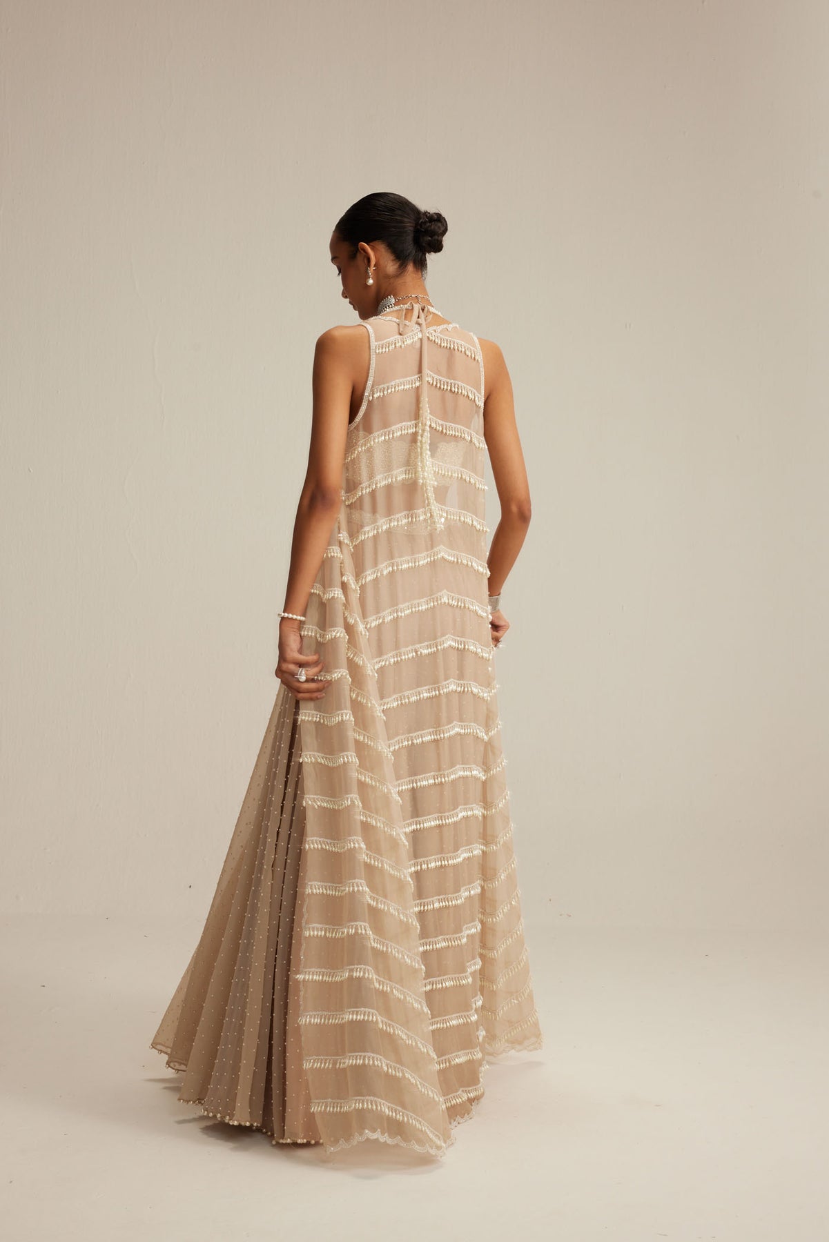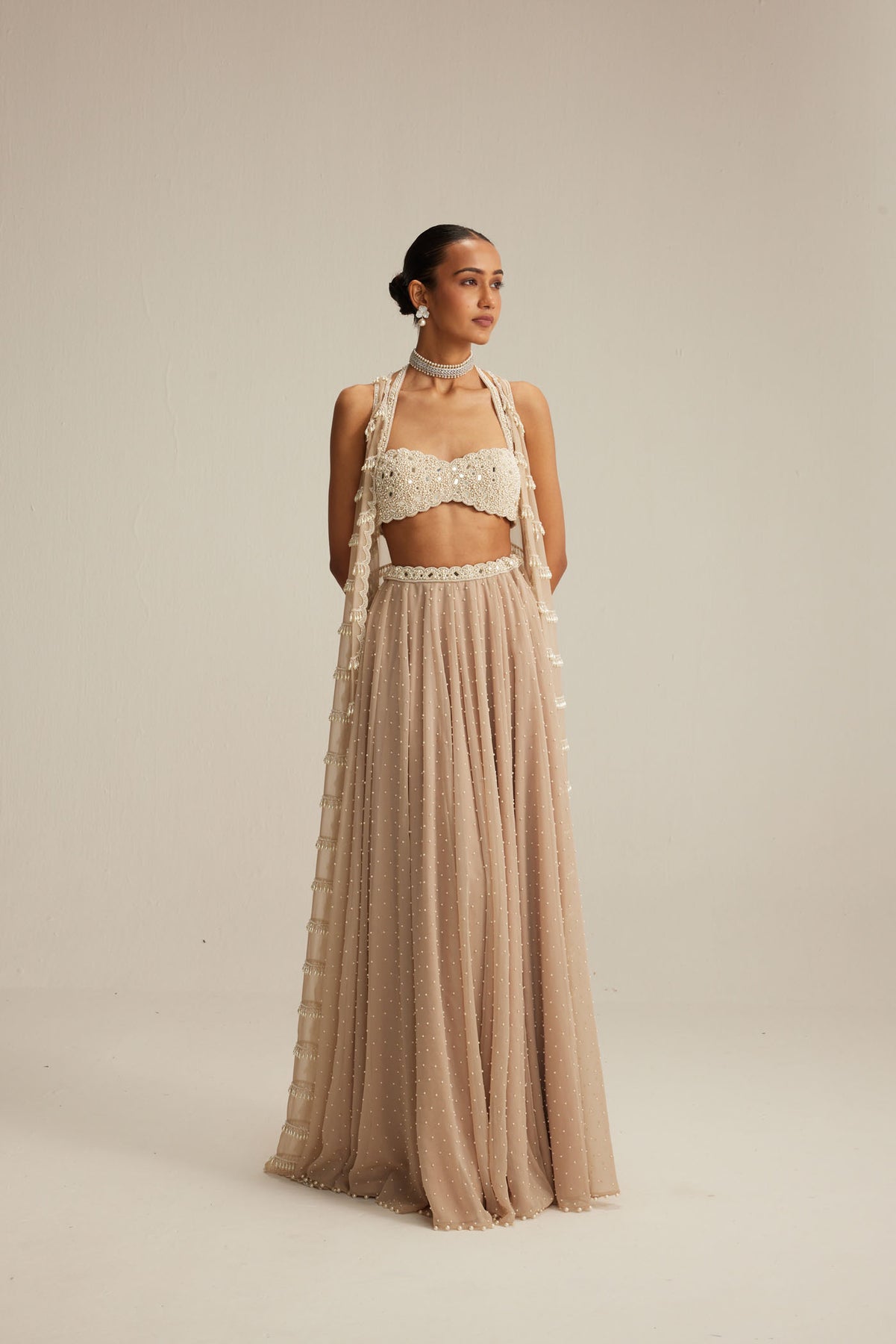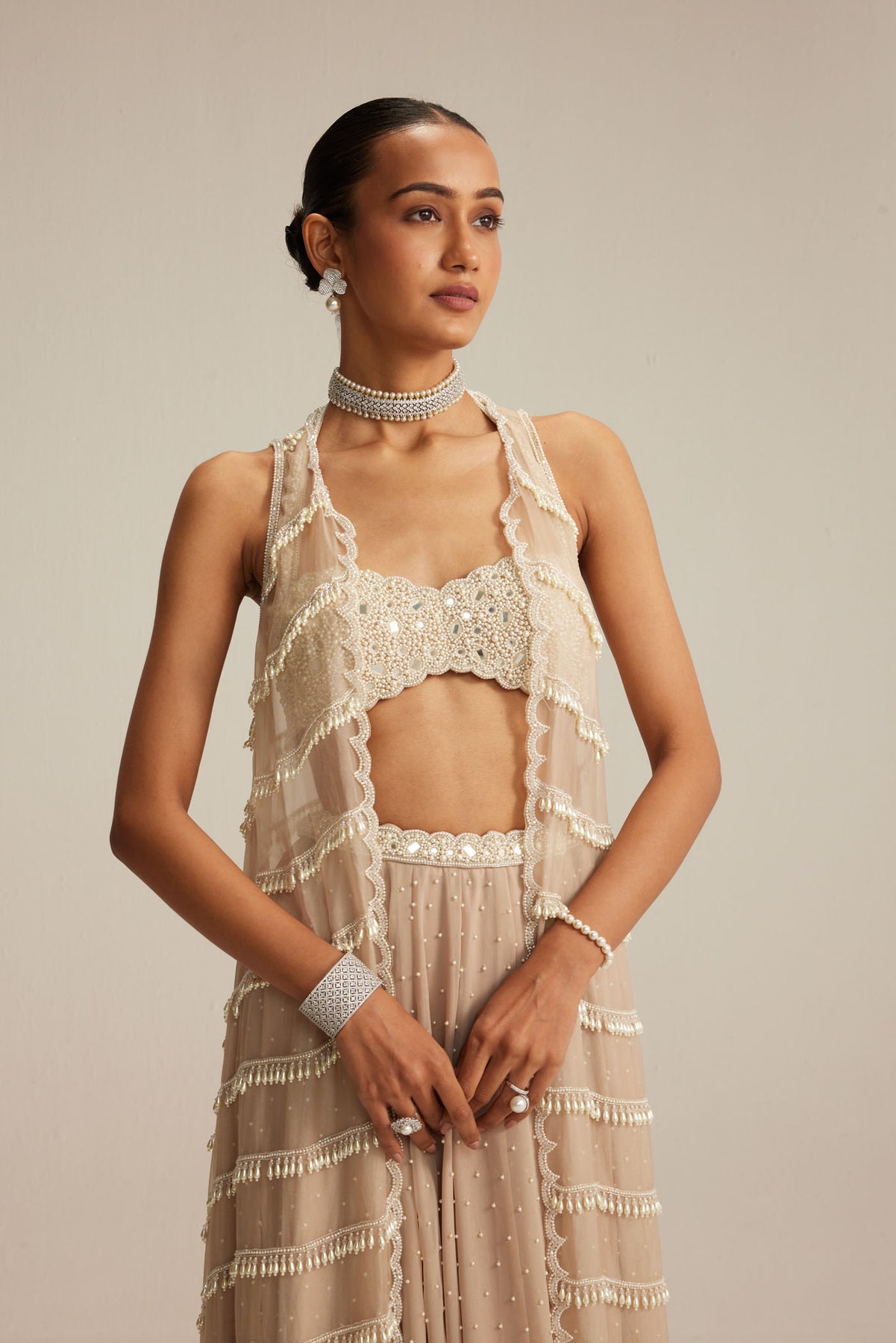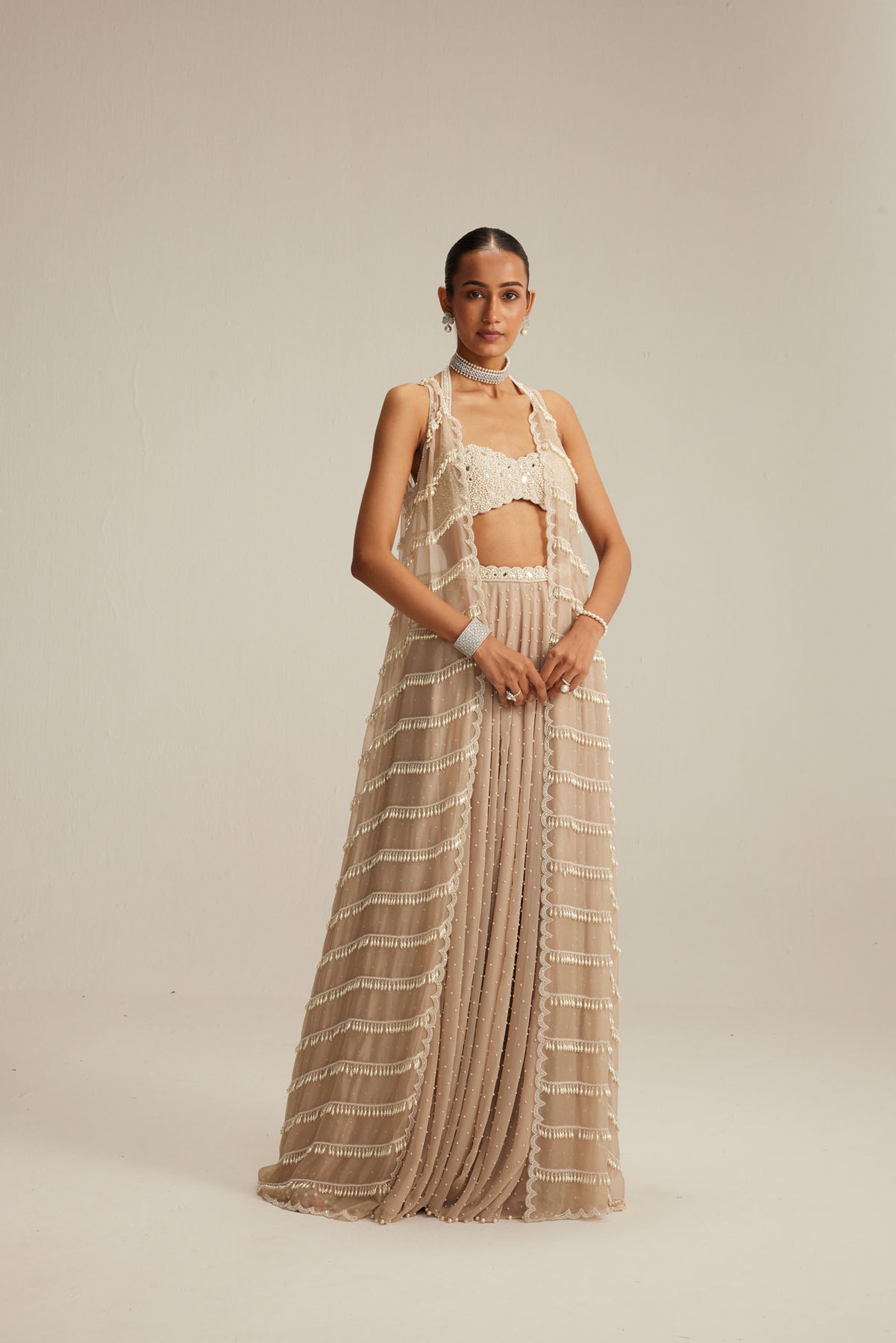Light beige Jacket set, adorned with mirror and pearl embroidery and cascading pearl tassels, paired with a heavily embroidered blouse and skirt.