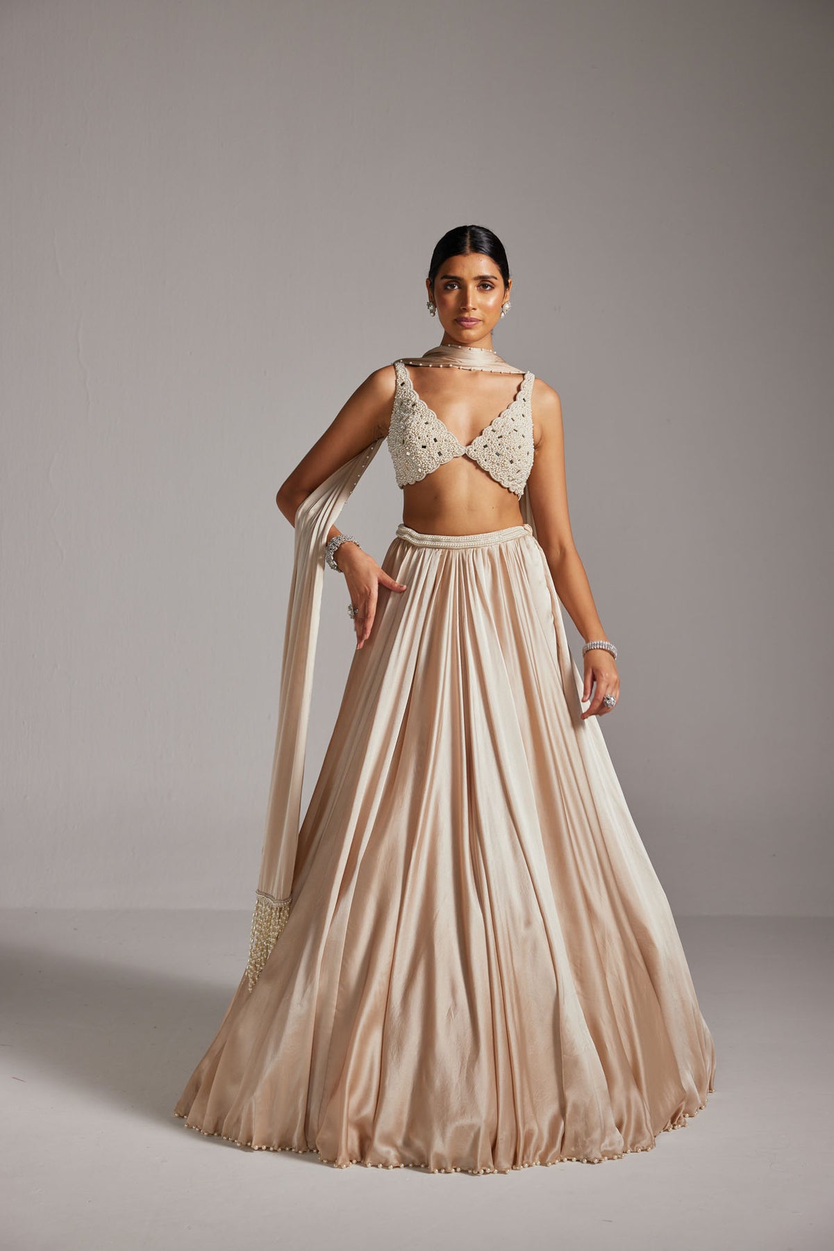 Light beige Satin skirt paired with a heavily embroidered V neck blouse and Stole.
