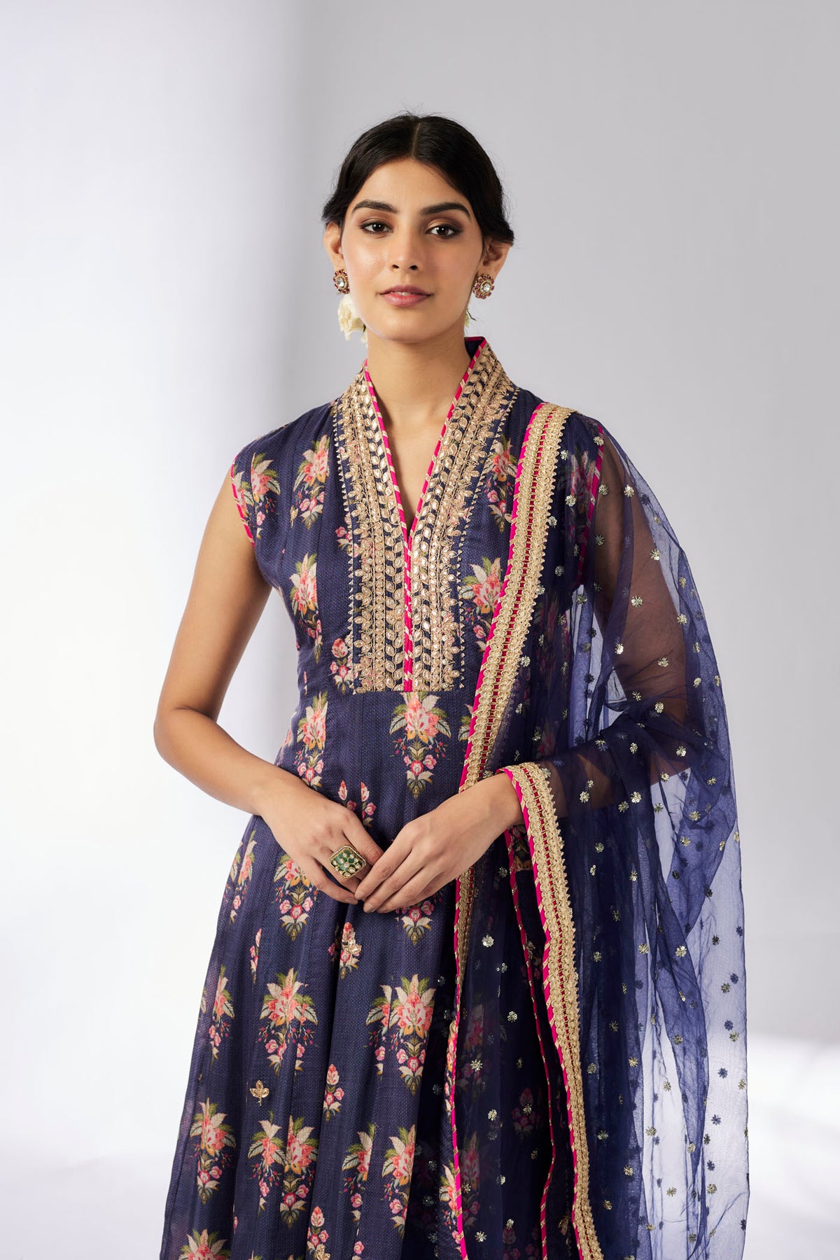 This pretty ensemble in our floral print , with an intricate border embroidery. The Anarkali with matching dupatta embroidered in sequins and gold thread, and plain churidar adds a feminine grace.