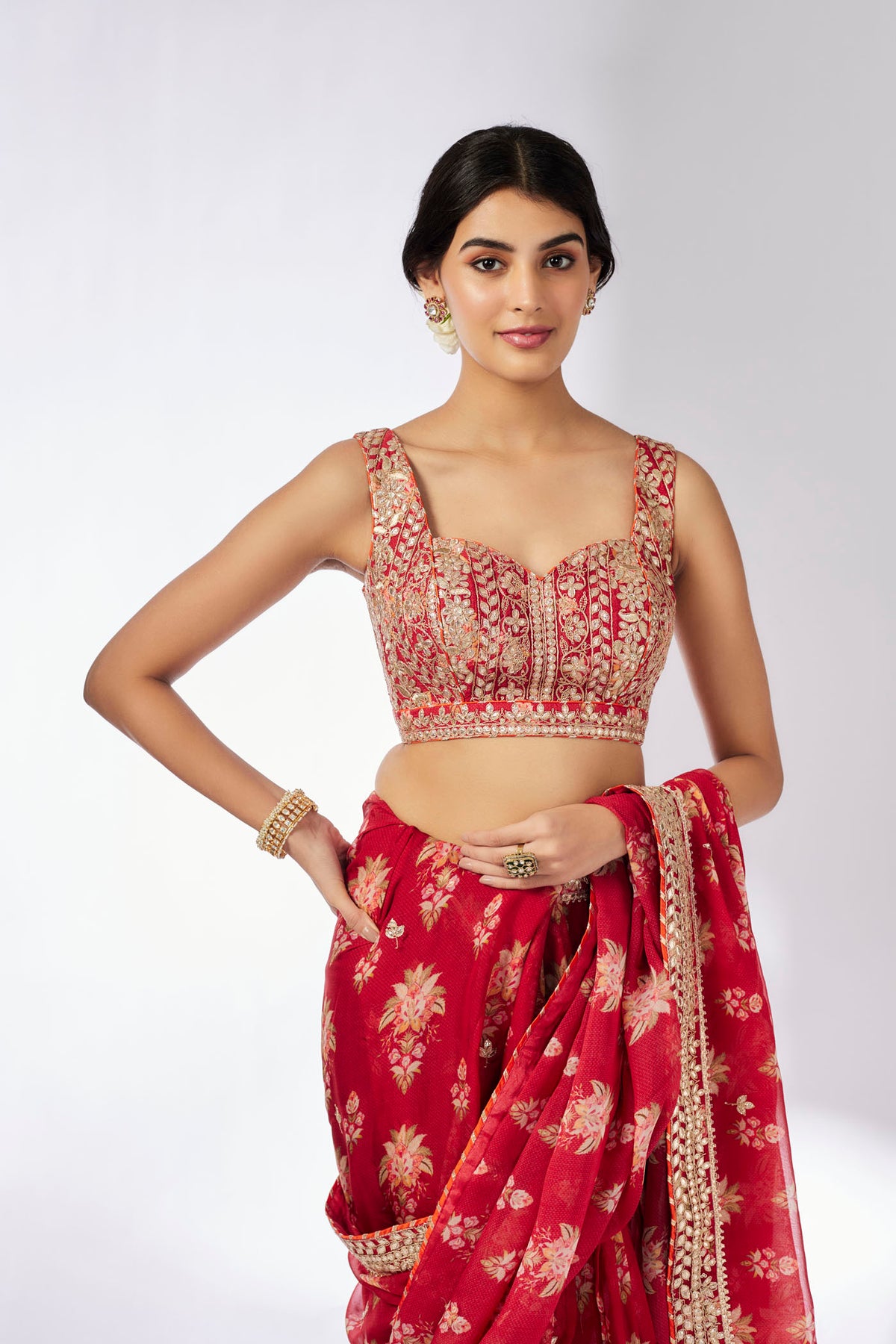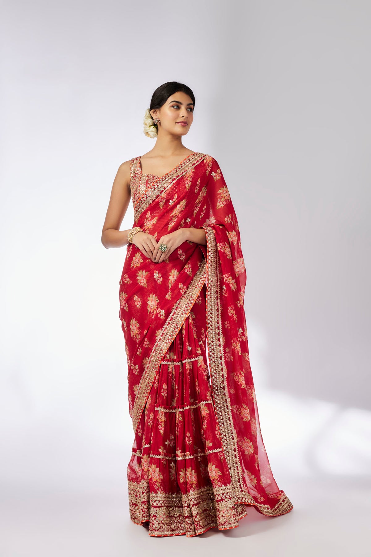 A Delicate, Floral Jaal, Layered Frill Saree With Flounce ,Flow and Intricate Embroidered Border is a Easy Wrap, The Classic Sleeveless Printed Blouse Adds Glamour And Glitz To The Ensemble.