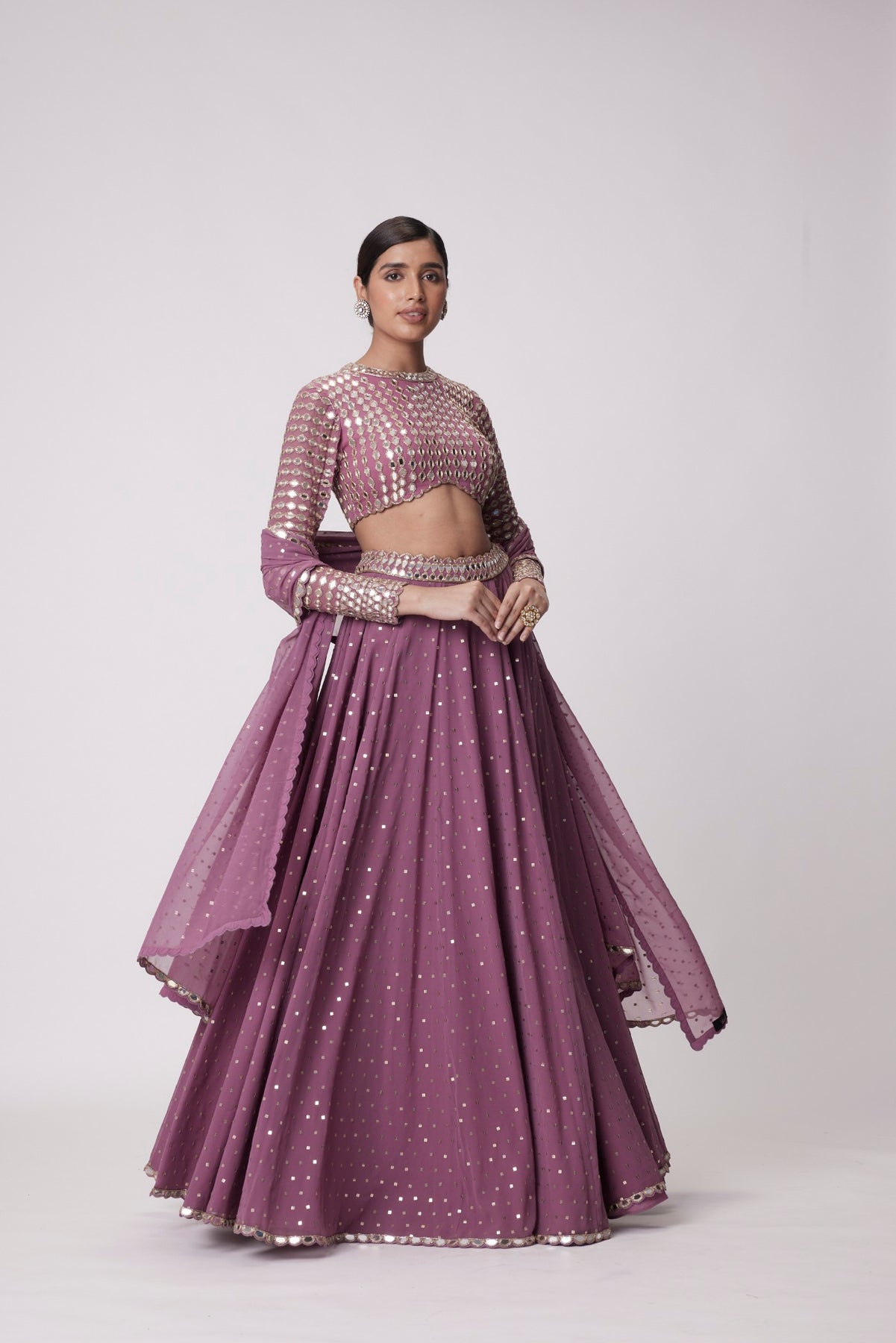 Mud Mauve Georgette Lehenga Pant And Dupatta Clubbed with Real Hand Cut Mirror Embroidered Full Sleeve Blouse.