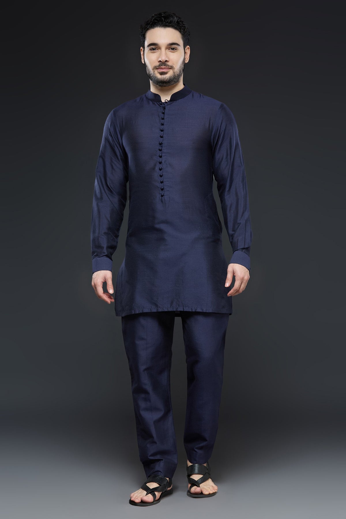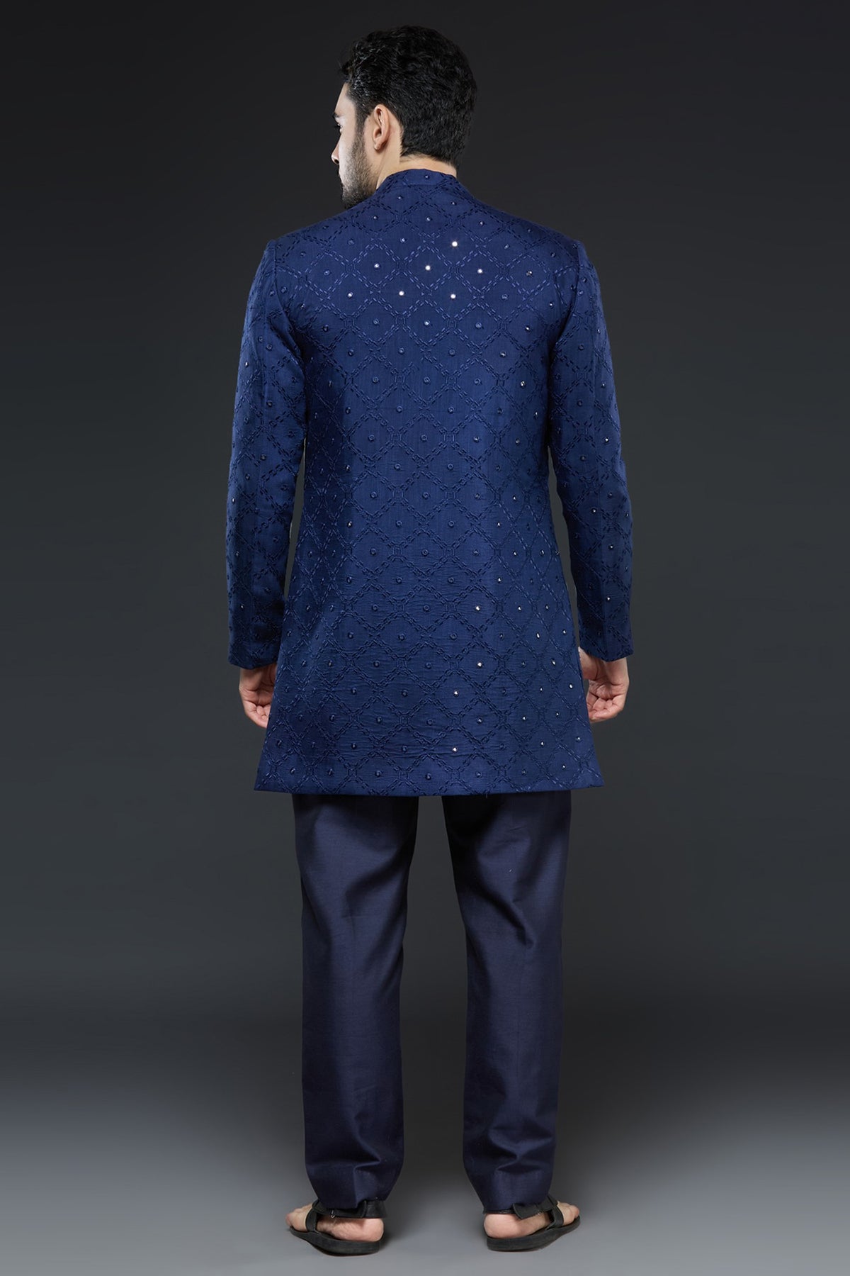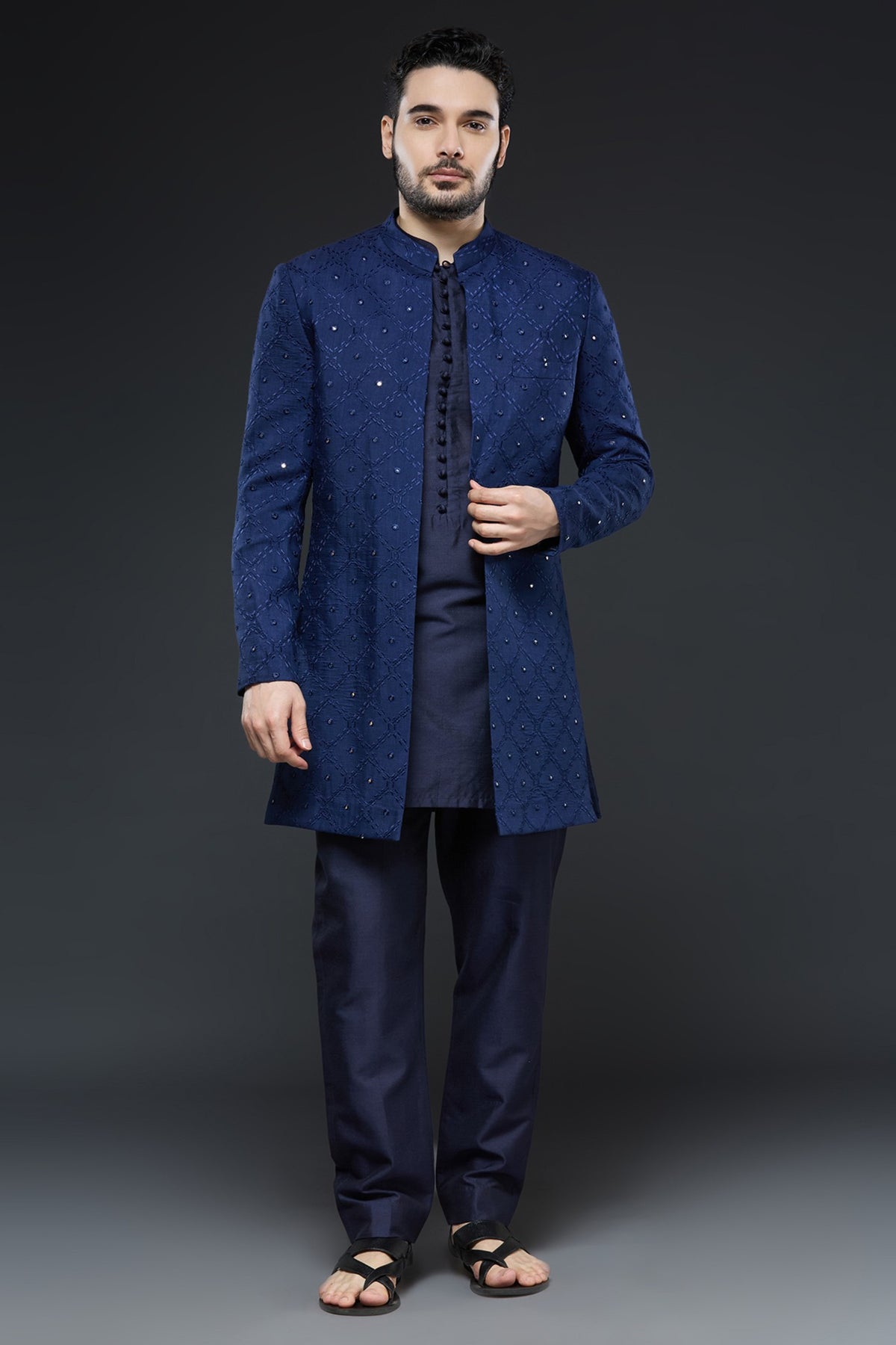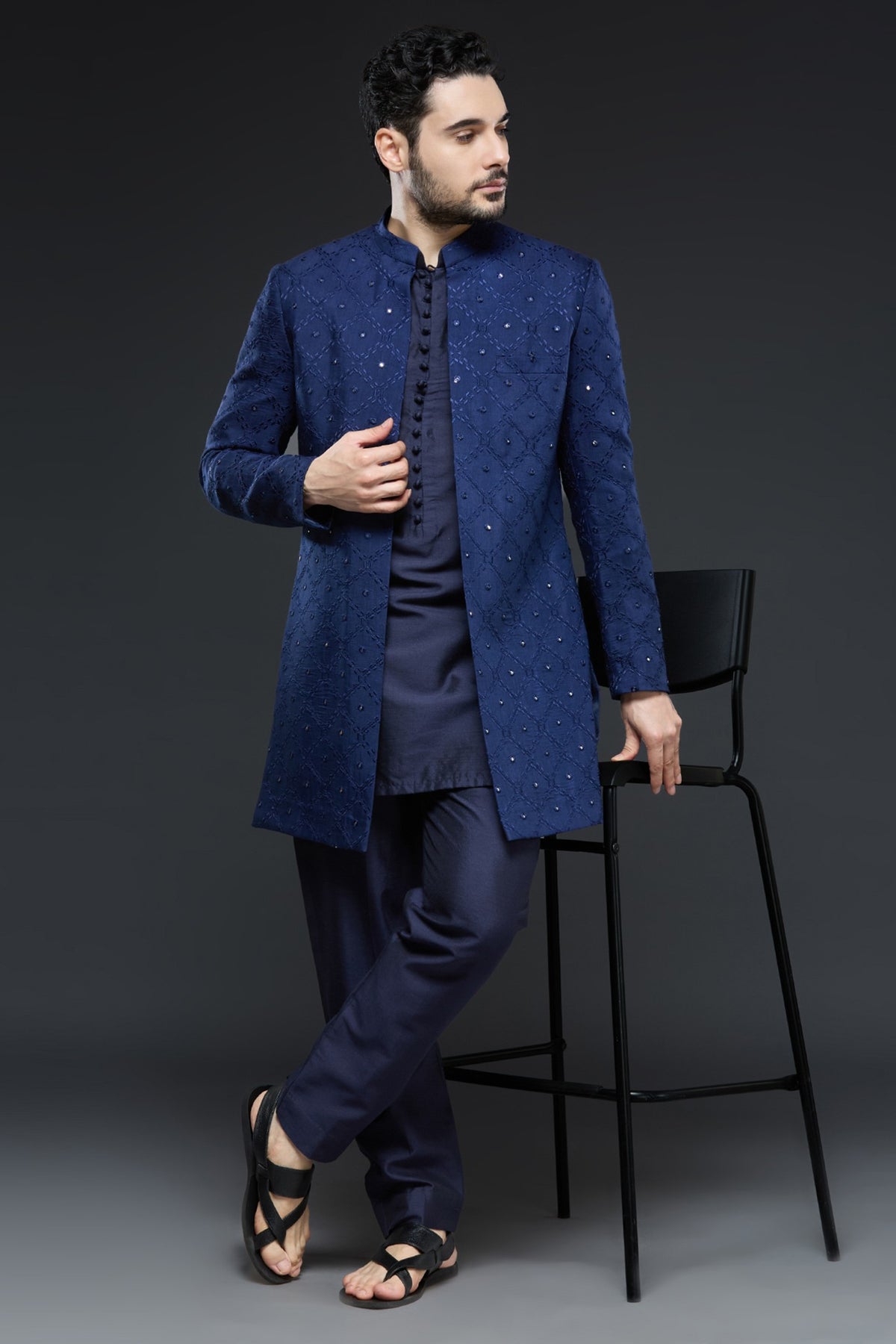 Navy Blue Art Mirror and Thread work sharwani open jacket set with Navy Blue kurta and slim pant set