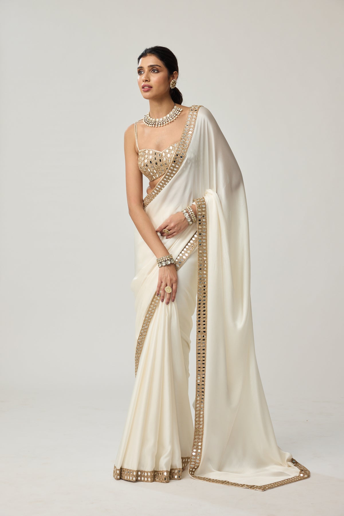 Off White Mirror hand embroidered Satin Saree clubbed with real hand cut mirror embroidered sleeveless blouse.