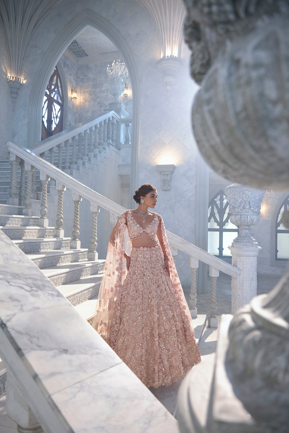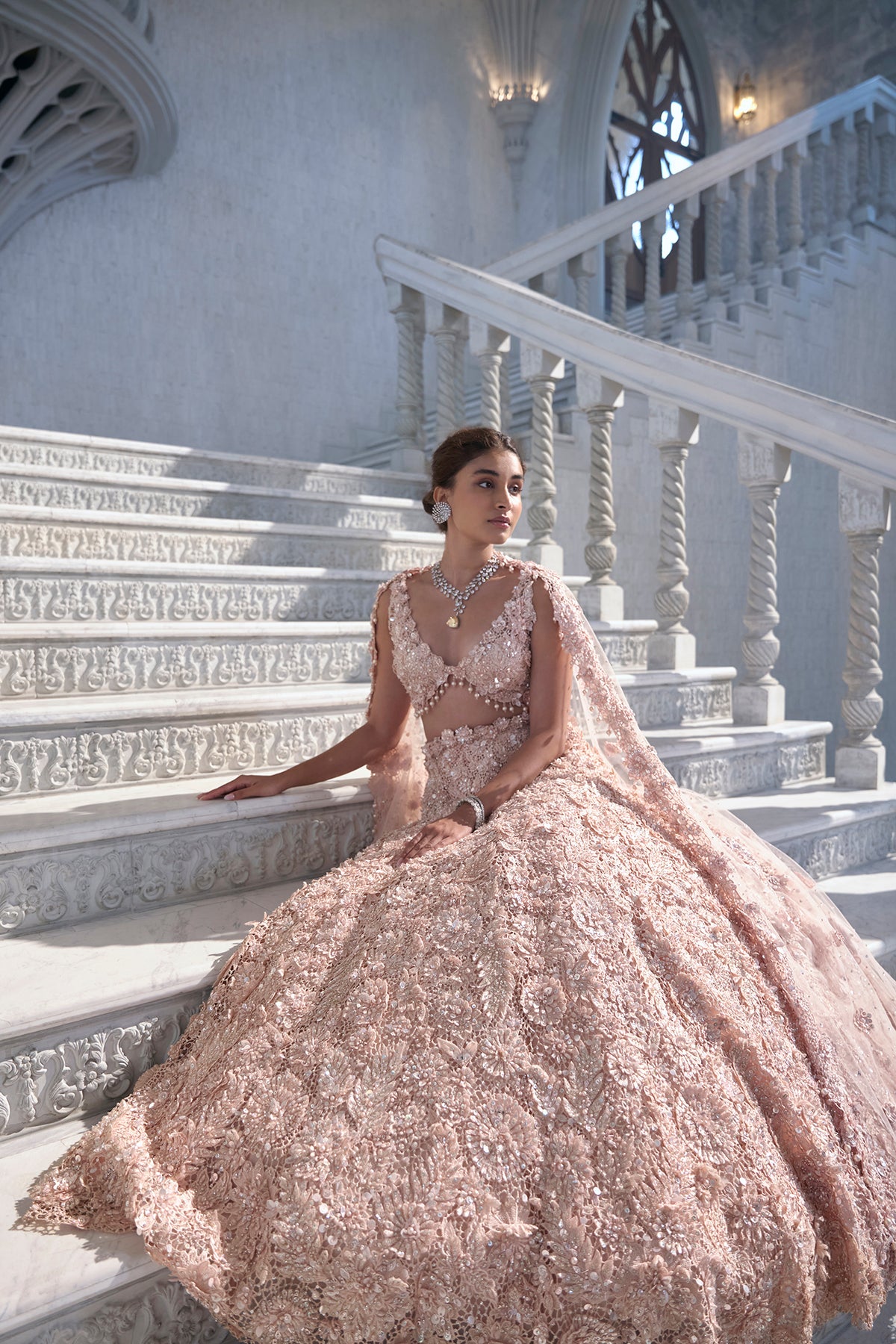 This lehenga set features heavy three-dimensional cut work embroidery in crystal, thread, pearl and sequin. The blouse shows cut work embroidery with delicate pearl tassels at the waist and 3D flowers at the back. It is paired with the heavily embroidered dupatta with floral motifs and pearl tassels all over.