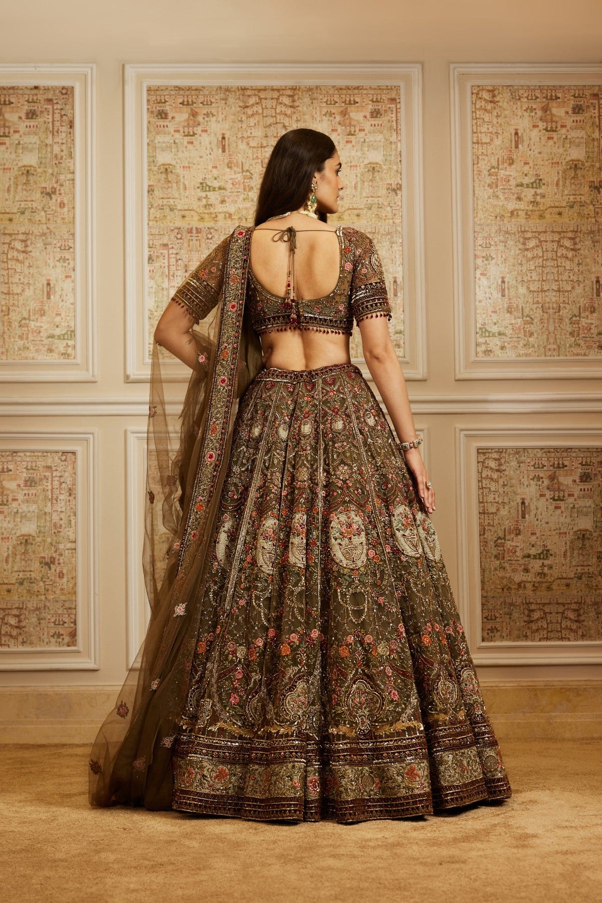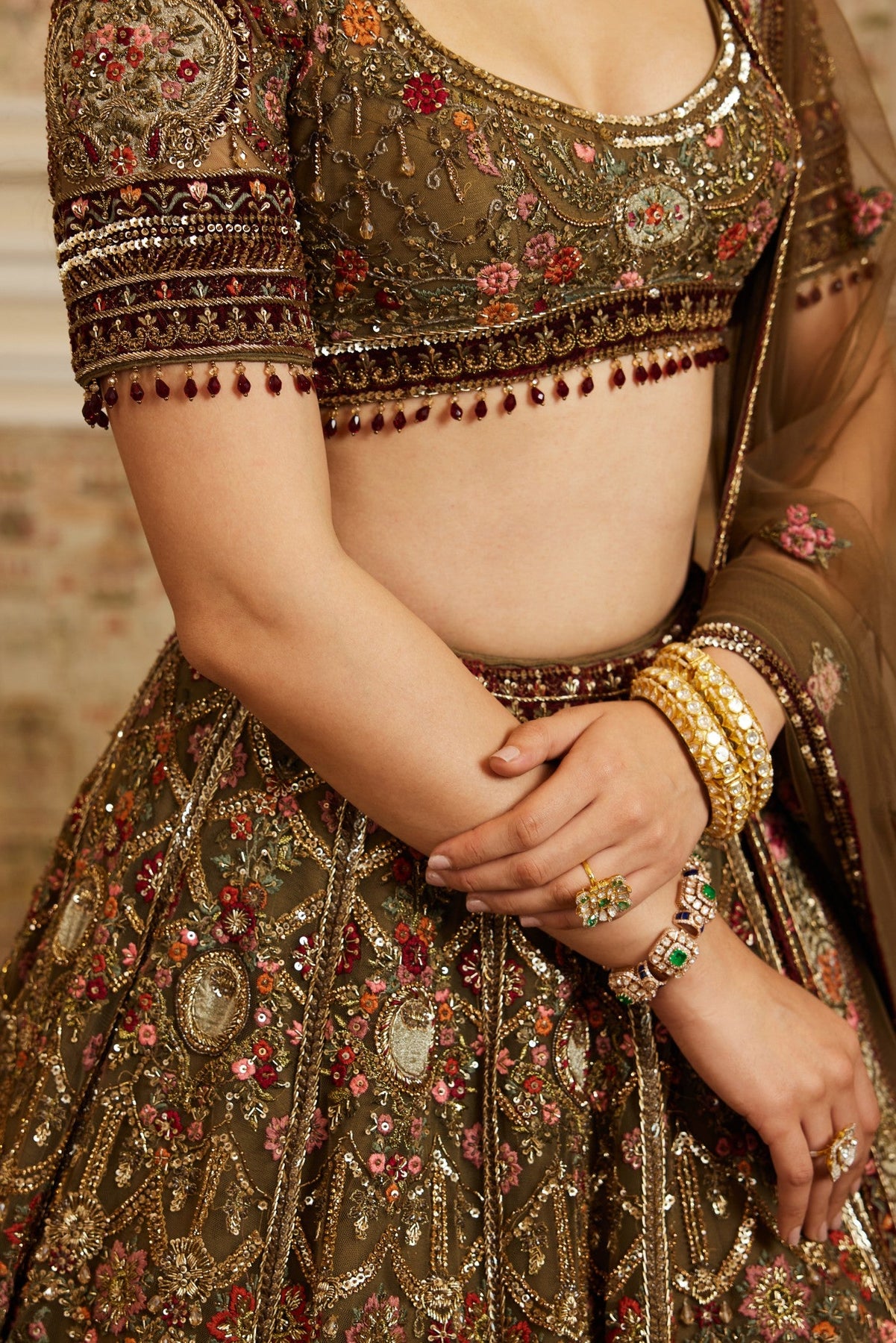 Exude regal charm in this intricately handcrafted lehenga set, designed to make a timeless statement. The ensemble features a rich olive-brown base adorned with exquisite zari, resham, and sequin embroidery, highlighted with delicate floral motifs in shades of crimson and gold. The blouse is styled with a flattering neckline and half sleeves, perfectly complementing the voluminous lehenga skirt that flows gracefully with every step. A sheer embroidered dupatta with ornate borders completes the look, adding elegance and sophistication.