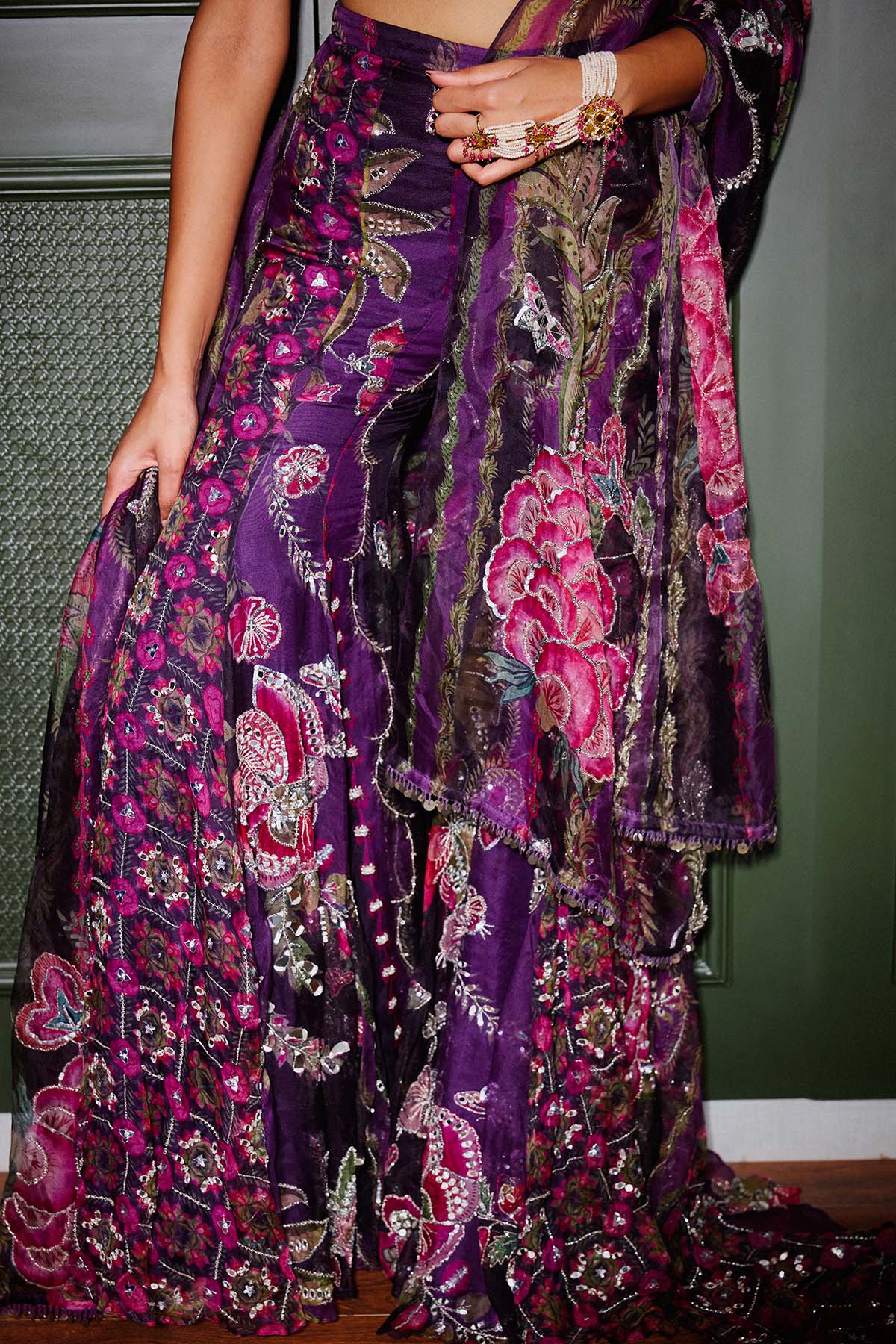 Hand embroidered Backless choli with trail sharara and dupatta