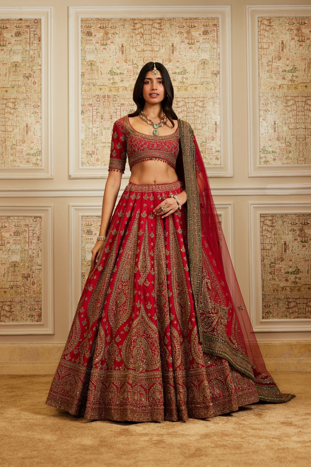 Celebrate timeless tradition with this classic red bridal lehenga, richly adorned with intricate zari and sequin embroidery. Crafted on raw silk, the blouse features delicate golden threadwork with a flattering scoop neckline, while the lehenga skirt is embellished with regal motifs and a grand border that exudes royal charm. Tiny paisley-floral shapes fall graciously all across the lehenga. The matching dupatta, based on net finished with an ornate border, enhances the ensemble’s grace and opulence.