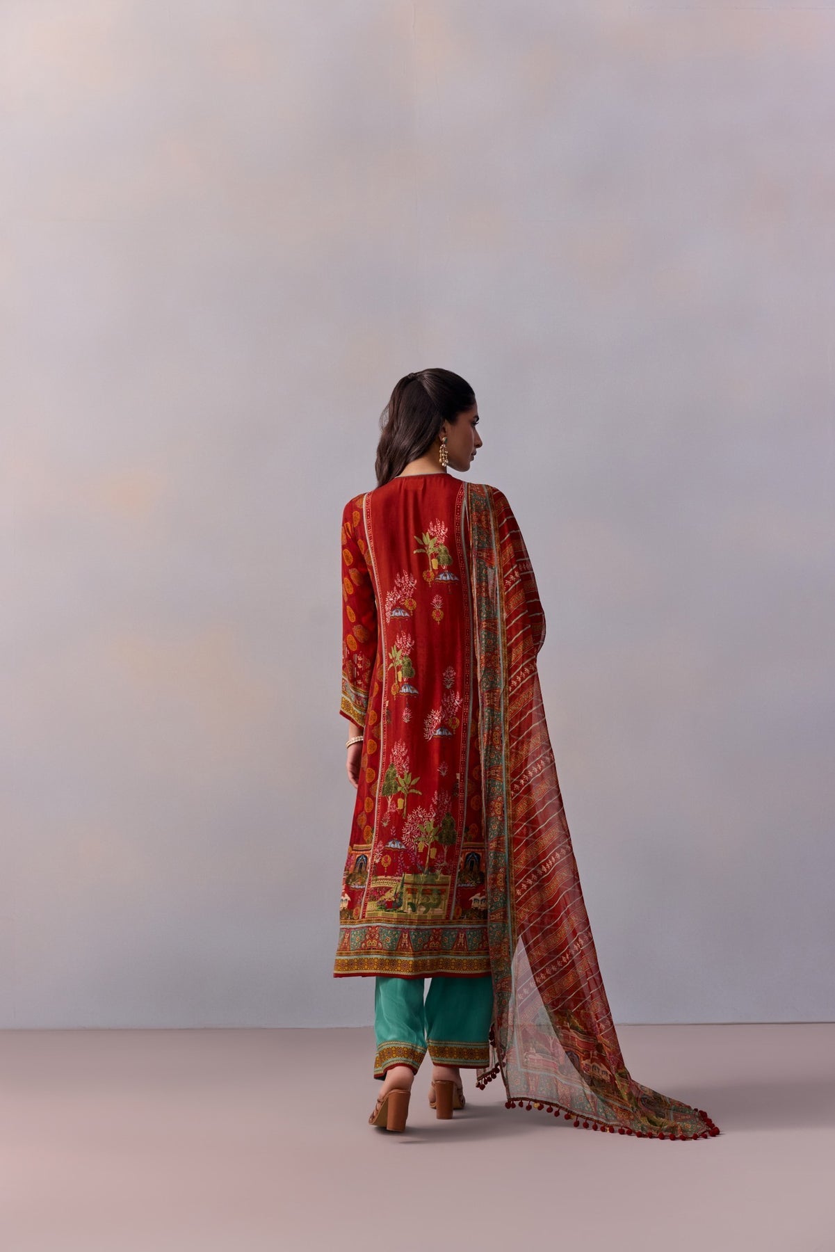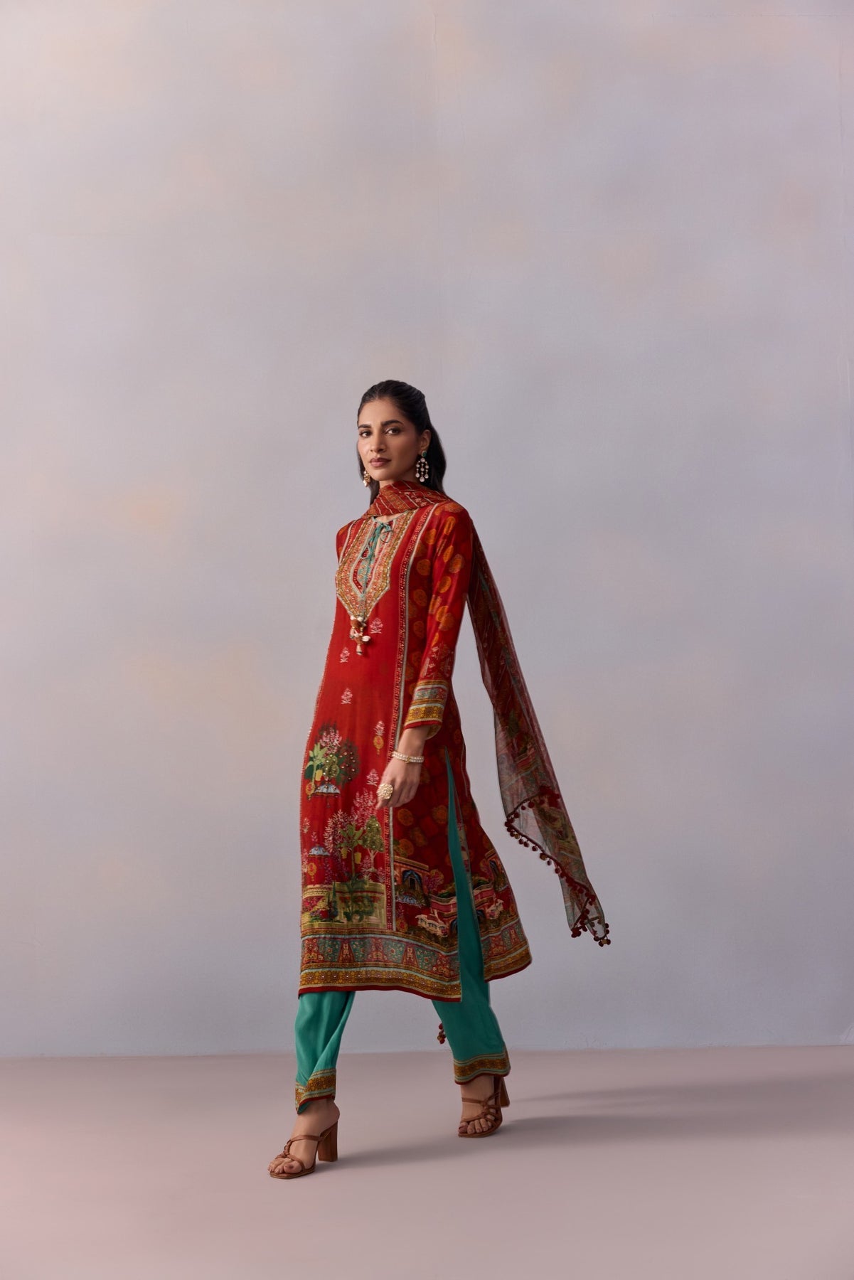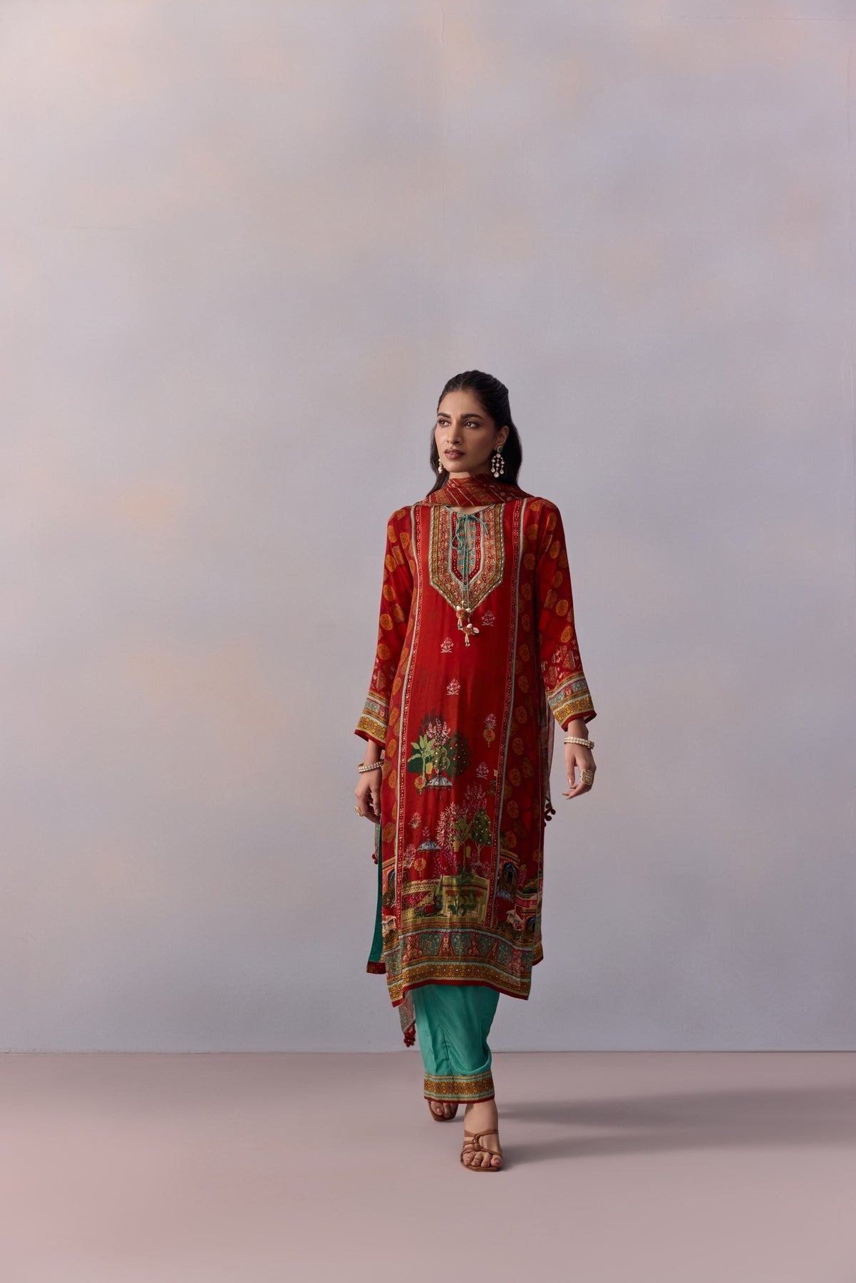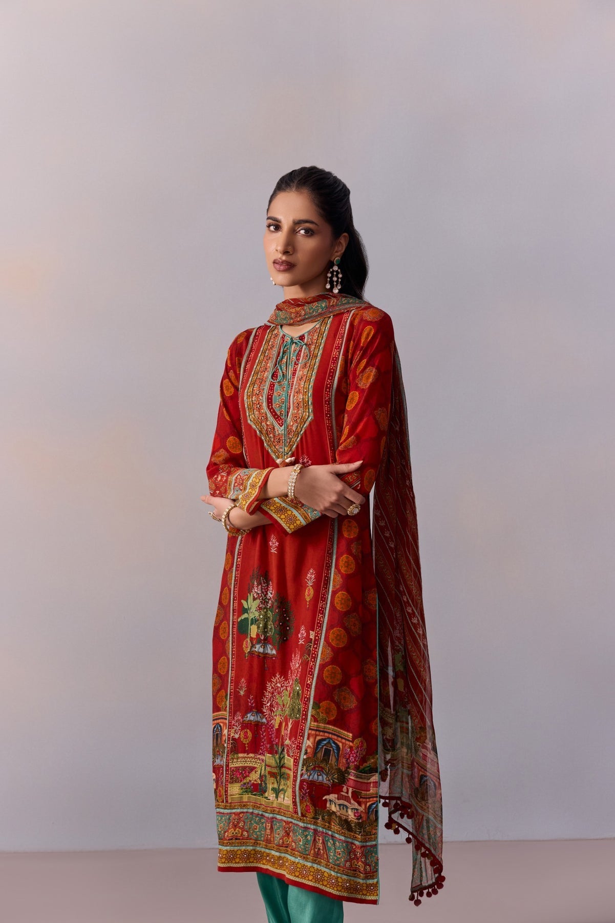 Featuring A miniature mughal Print straight suit adorned with pretty embroidery detailing and styled with straight pants. The Set comes with a Coordinated dupatta in soft georgette fabric. Perfect Suit Design For festive occasaions.