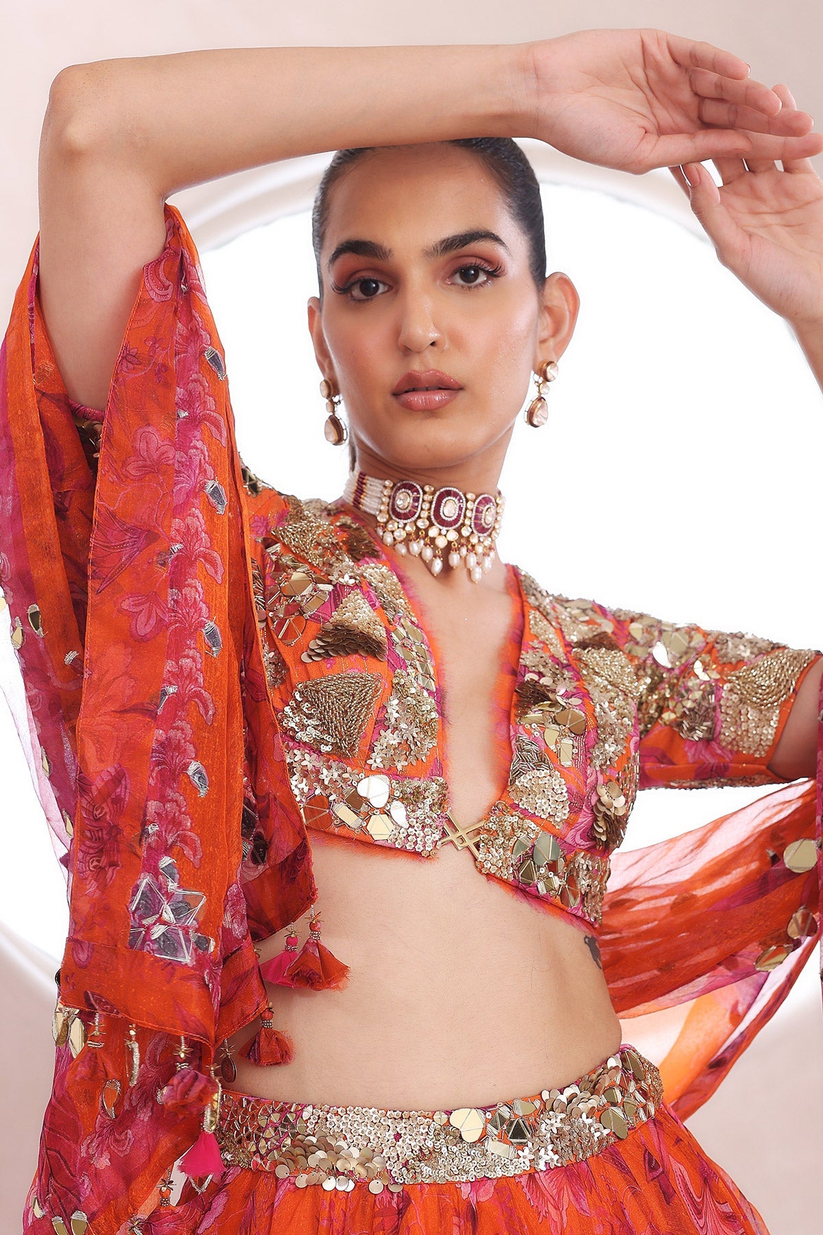 EMBROIDERED BLOUSE WITH PRINTED LEHENGA AND DUPATTA