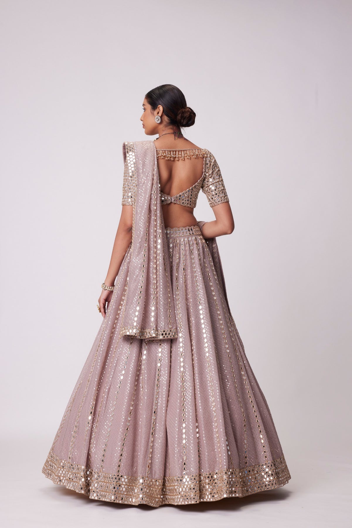 Ash Pink Sequin Embroidered Lehenga And Dupatta Clubbed with Real Hand Cut Mirror Embroidered Elbow Sleeve Length Blouse.