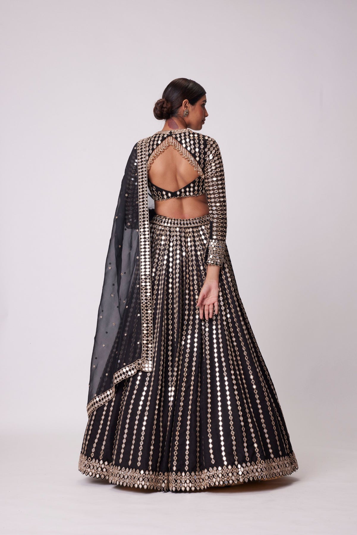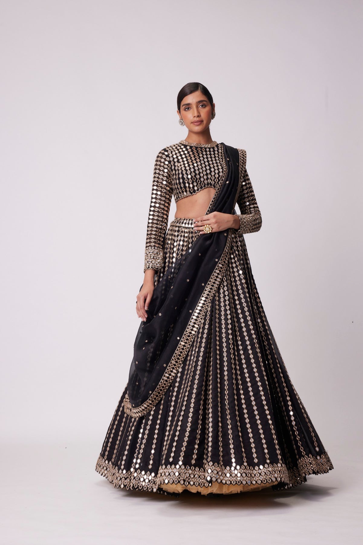 Black Linear Mirror Embroidered Lehenga And Dupatta Clubbed with Real Hand Cut Mirror Embroidered Full Sleeve Blouse.
