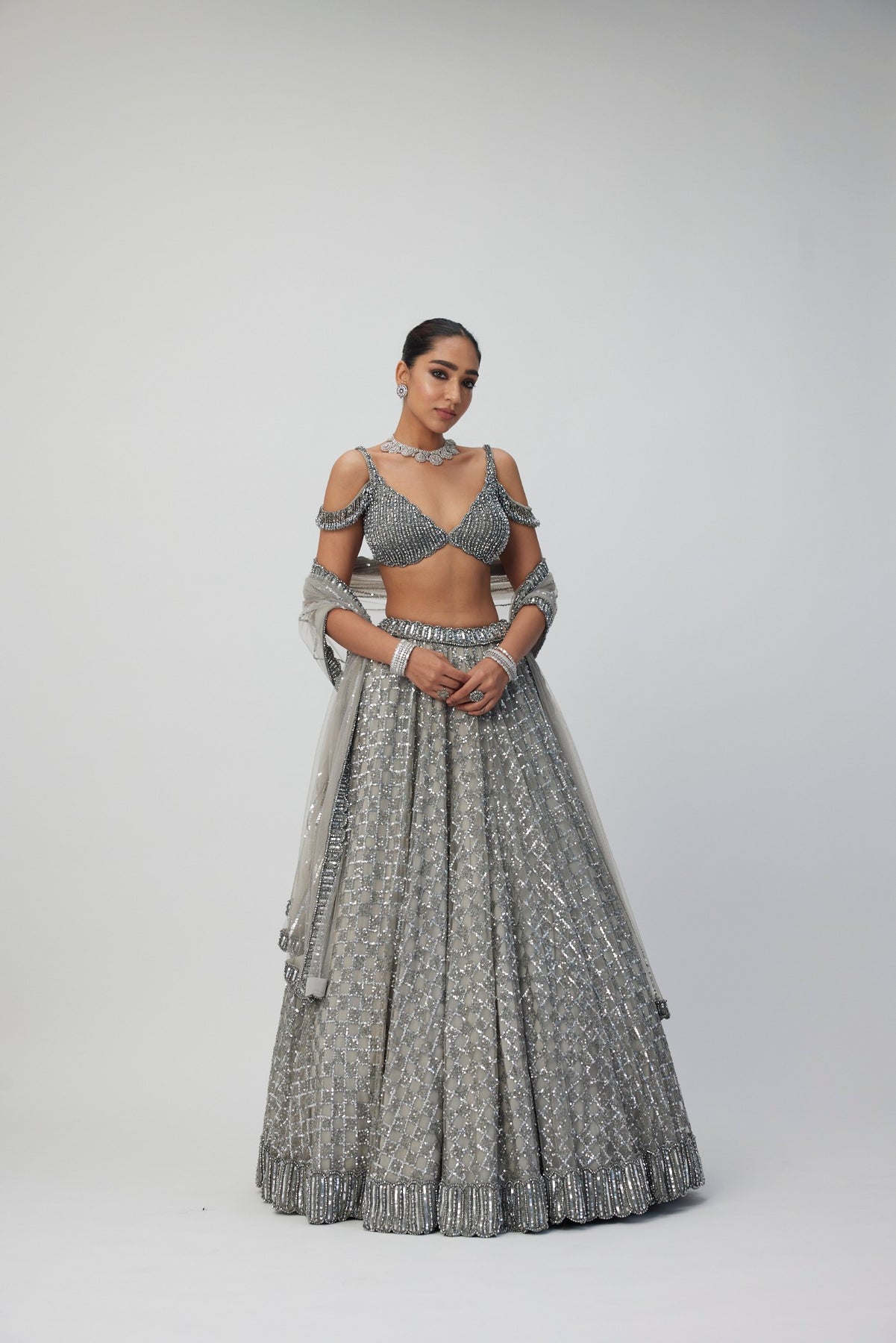 Intricately hand embroidered Lehenga And Dupatta featuring sequins and crystal embroidery clubbed With jewelled blouse with crystal embellishments.