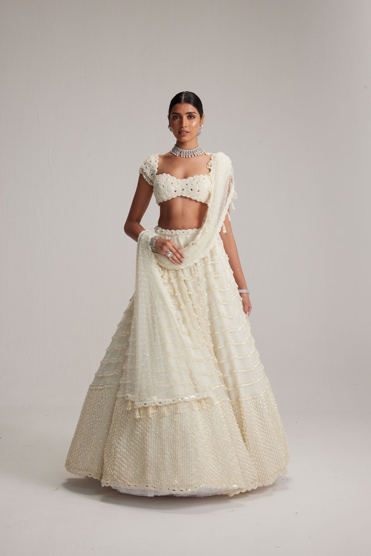 Off white mirror and pearl lehenga set featuring intricate mirror and pearl Drop embroidery, paired with a heavily embroidered cap sleeve blouse and dupatta .