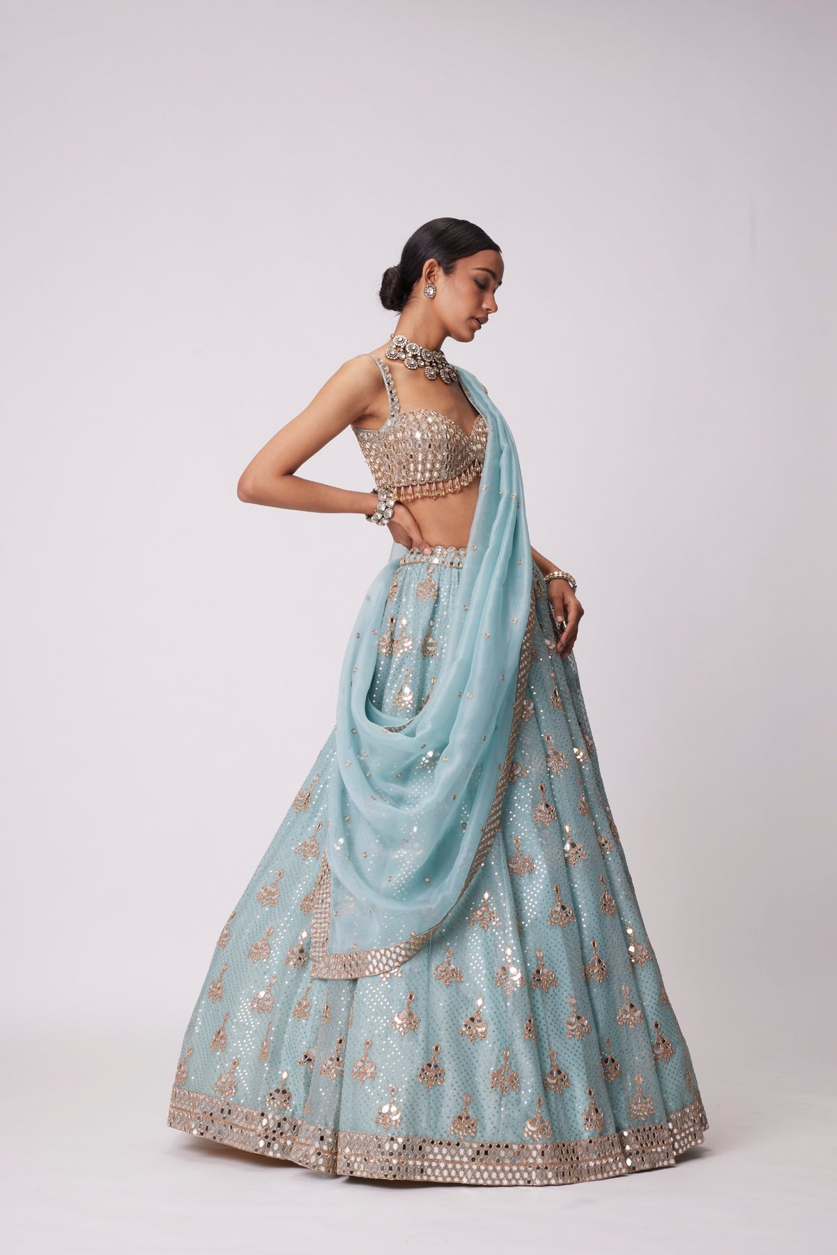 Powder Blue Organza Sequin Embroidered Lehenga And Dupatta Clubbed With a Heavily Mirror embellished sleeveless blouse.