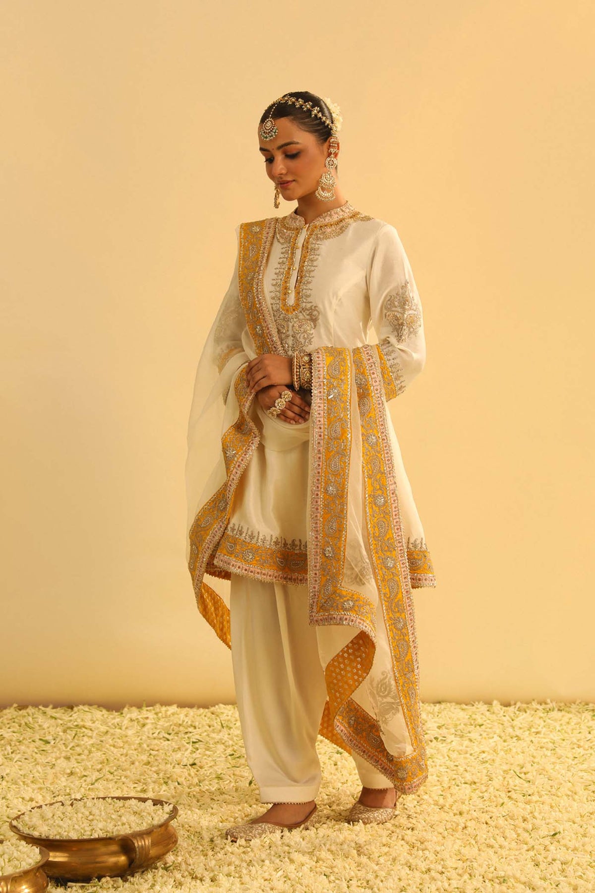 The Amani ensemble, crafted from luxurious Silk Chanderi, features our signature heritage Kashmiri Tilla embroidery. It is meticulously adorned with Appliqué, Gota and Kundan work. It features a zero neck with collar-placket, three quarter sleeves and is paired with a Salwar and dupatta. It makes use of Chanderi Silk Banarsi fabric for the final touch.