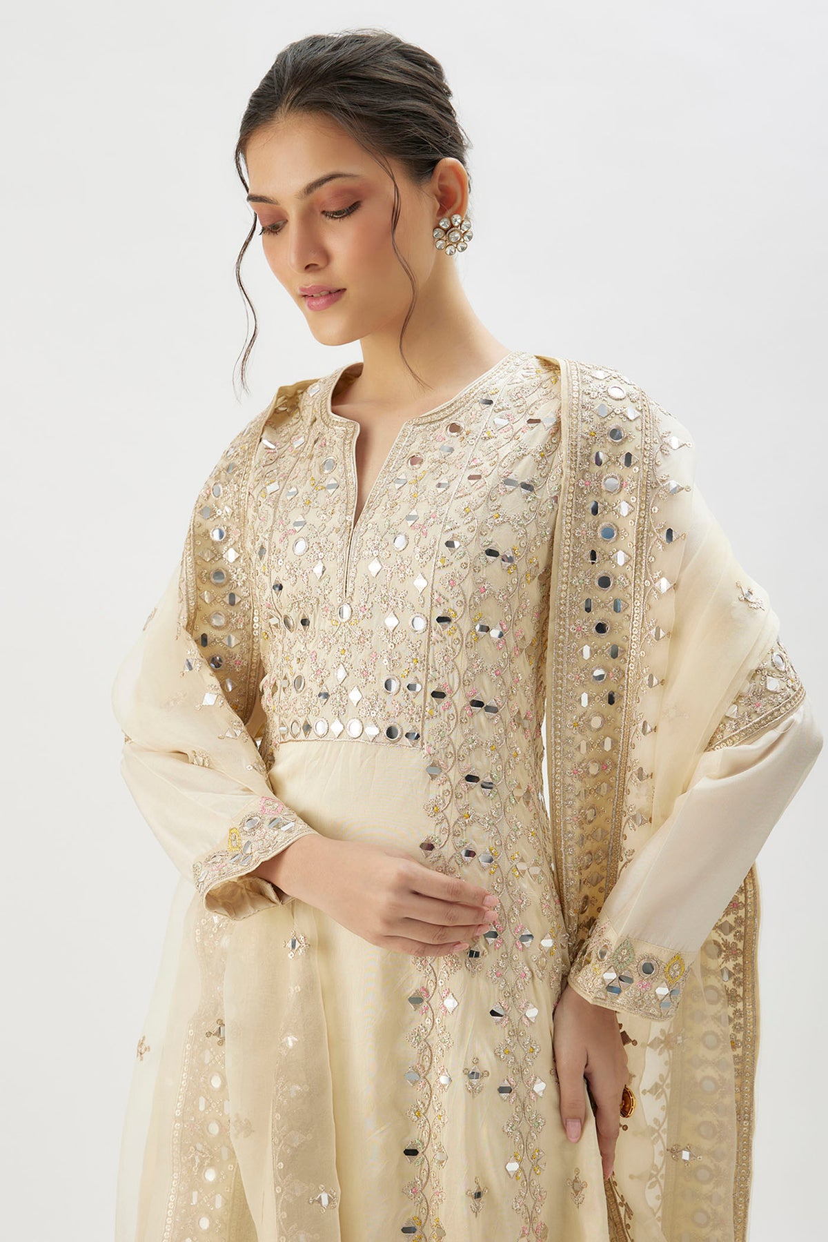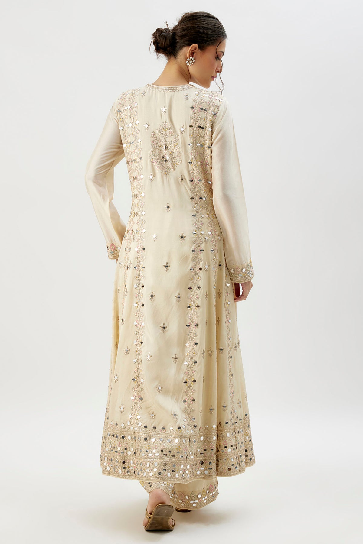 This Anarkali suit shows intricate embroidery with floral and geometric motifs, accentuated by delicate mirror work throughout the fabric. The full sleeves and a defined neckline lend a modest yet chic vibe. Paired with matching palazzo pants adorned with similar detailing at the hem and embroidered dupatta completes the look.