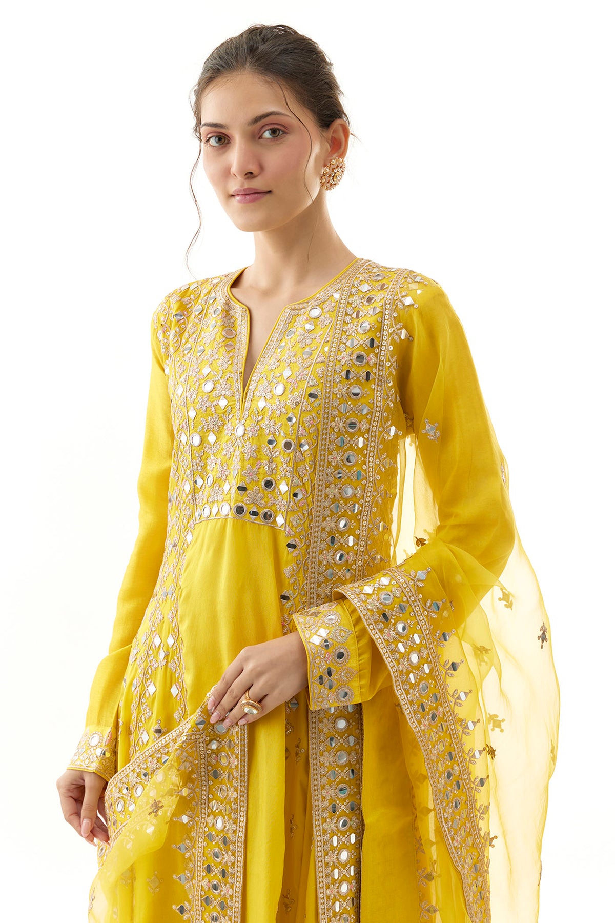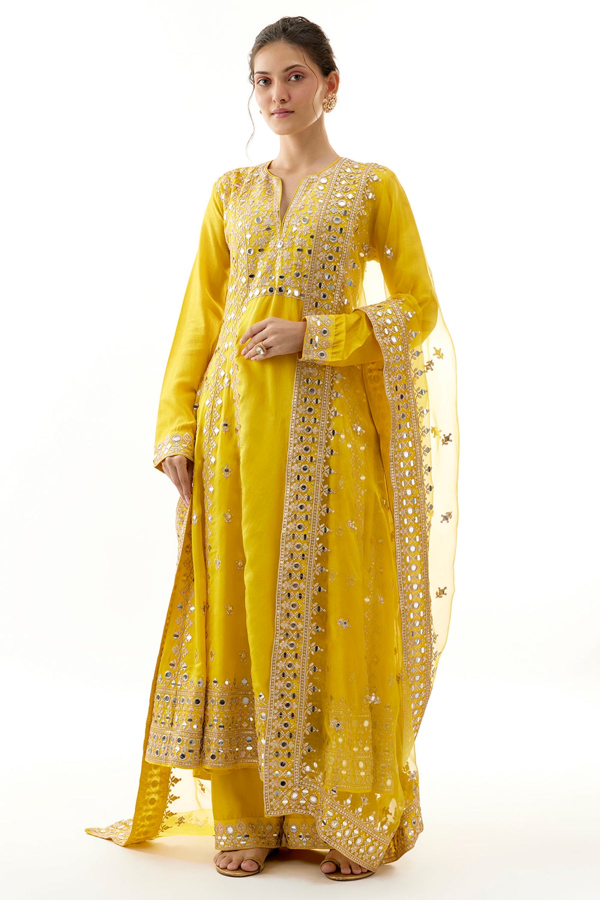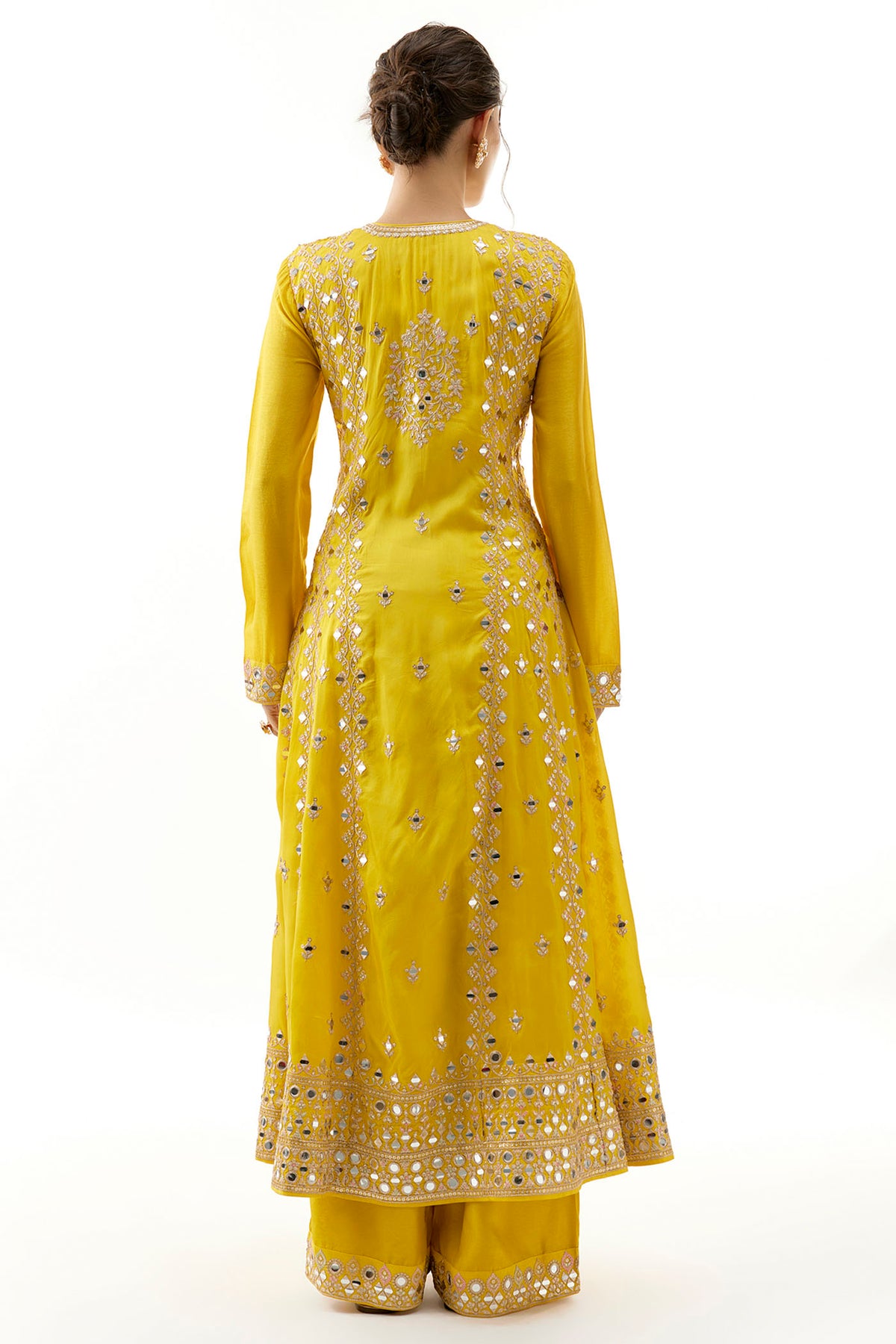 This Anarkali suit shows intricate embroidery with floral and geometric motifs, accentuated by delicate mirror work throughout the fabric. The full sleeves and a defined neckline lend a modest yet chic vibe. Paired with matching palazzo pants adorned with similar detailing at the hem and embroidered dupatta completes the look.
