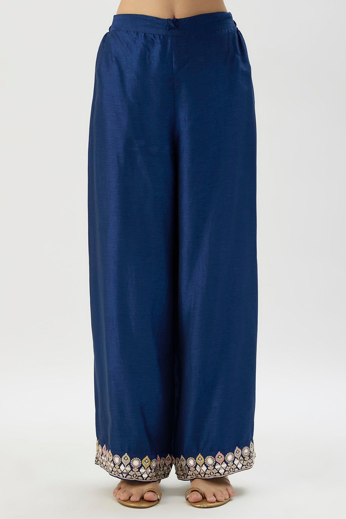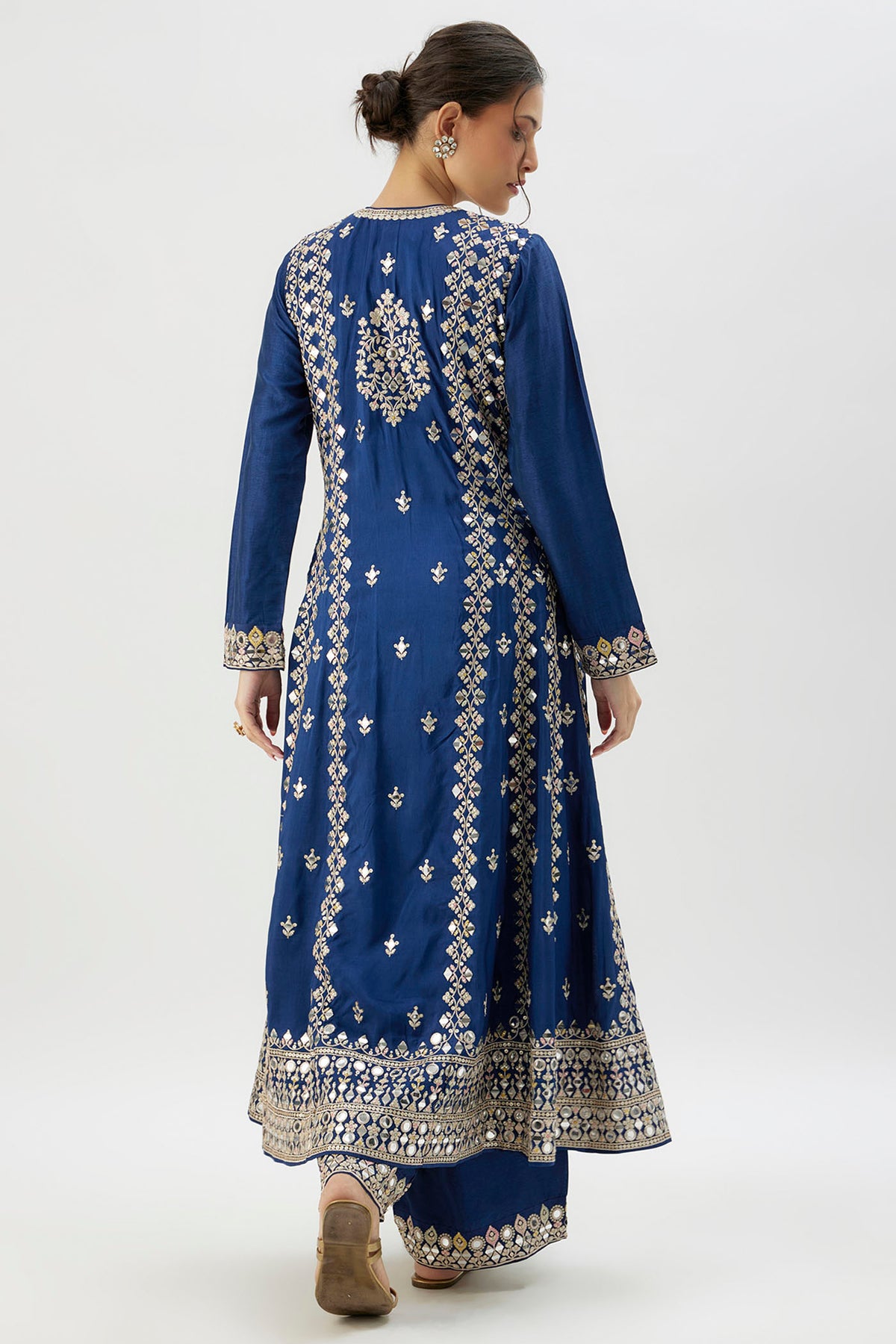 This Anarkali suit shows intricate embroidery with floral and geometric motifs, accentuated by delicate mirror work throughout the fabric. The full sleeves and a defined neckline lend a modest yet chic vibe. Paired with matching palazzo pants adorned with similar detailing at the hem and embroidered dupatta completes the look.