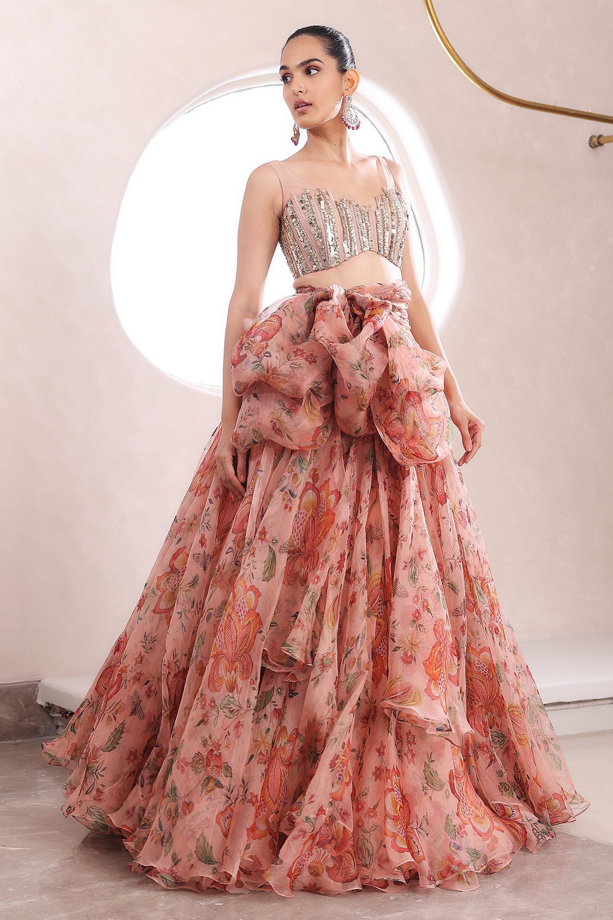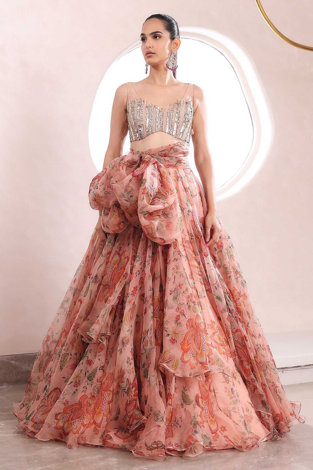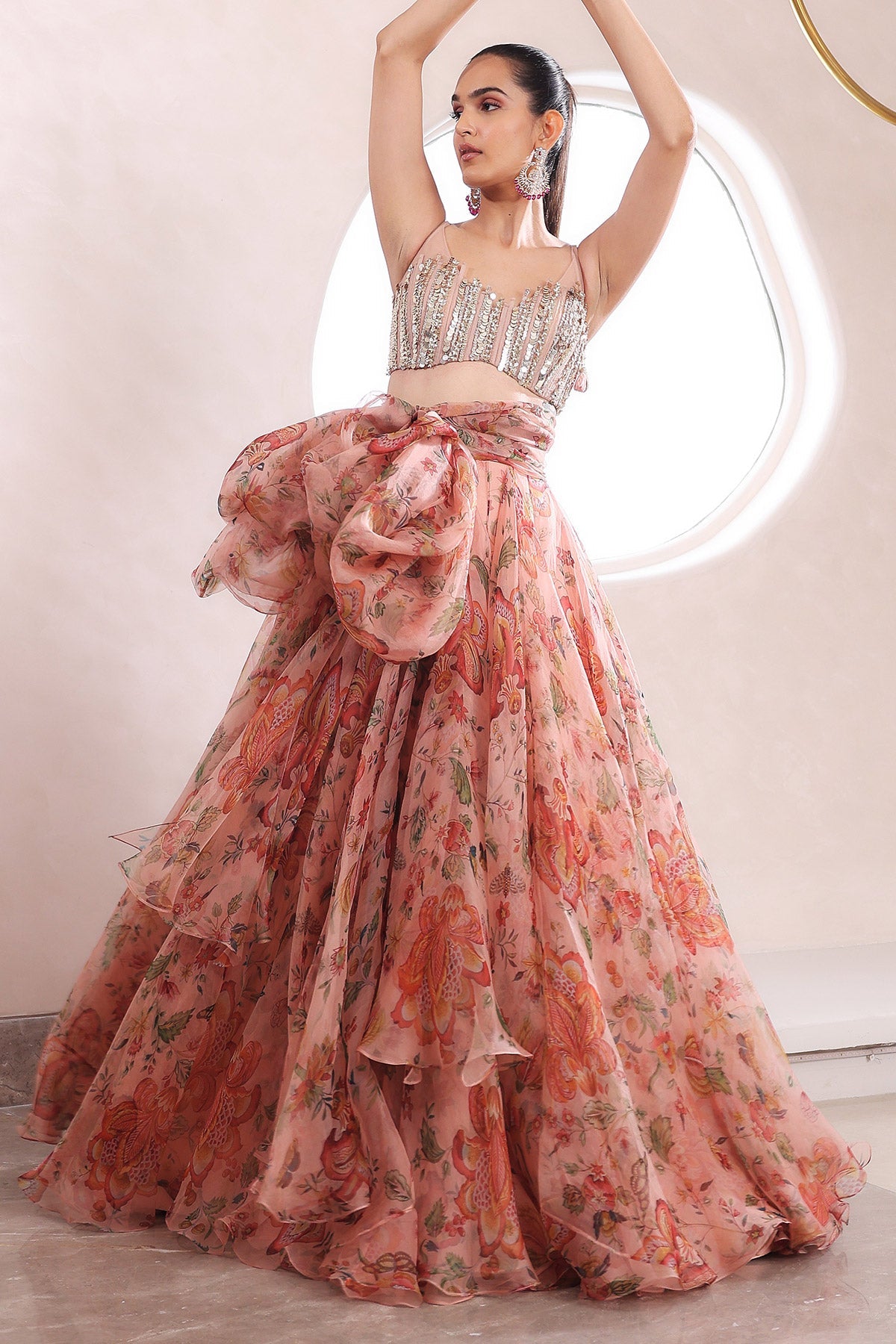 EMBROIDERED BLOUSE WITH PRINTED BOW LEHENGA