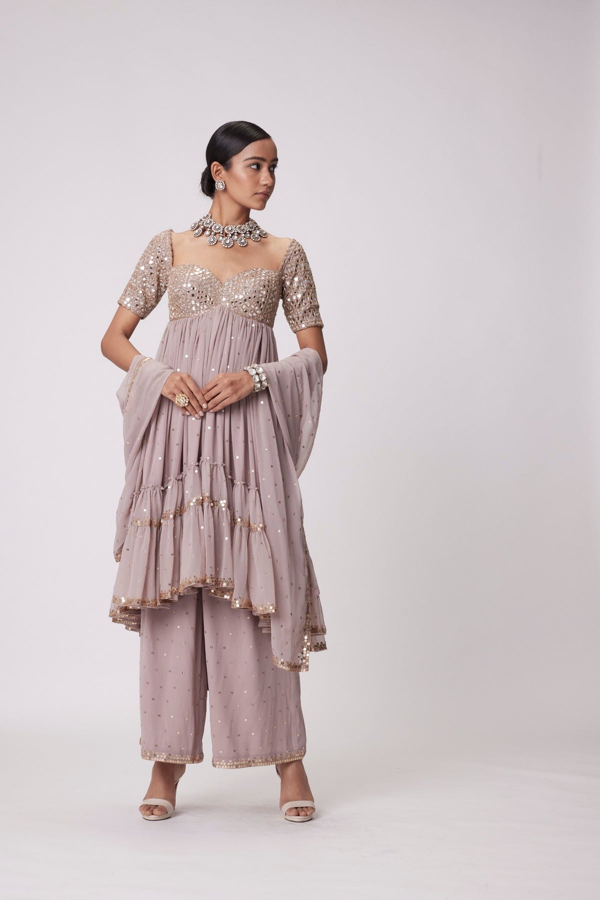 Ash Pink hand embroidered Kurta, Pants and dupatta.