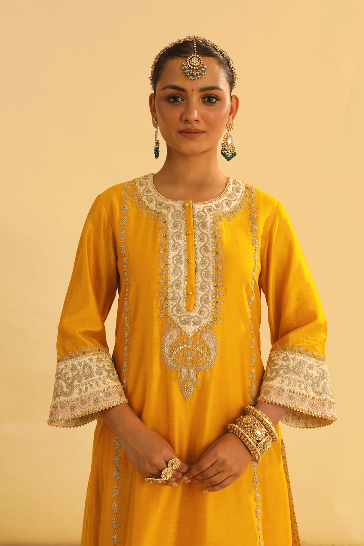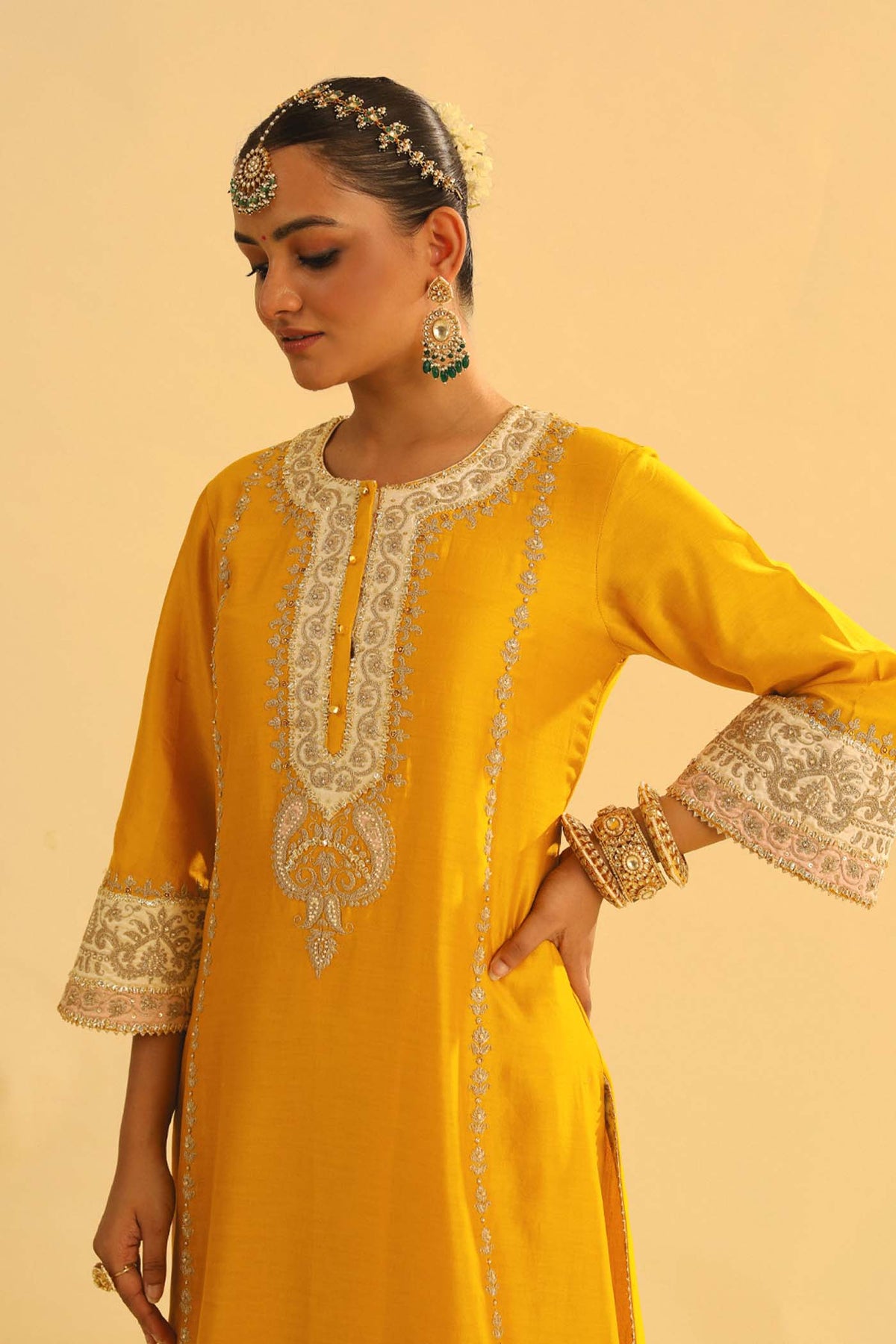 The Asmira ensemble, crafted from luxurious Silk Chanderi, features our signature heritage Kashmiri Tilla embroidery. It is meticulously adorned with Appliqué, Gota and Kundan work. It features a zero neck with placket, three quarter sleeves and is paired with a Straight palazzo and dupatta. It makes use of Chanderi Silk Banarsi fabric for the final touch.